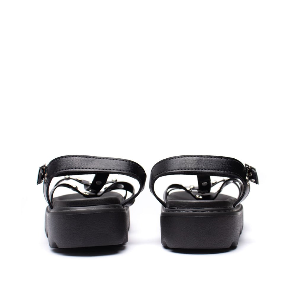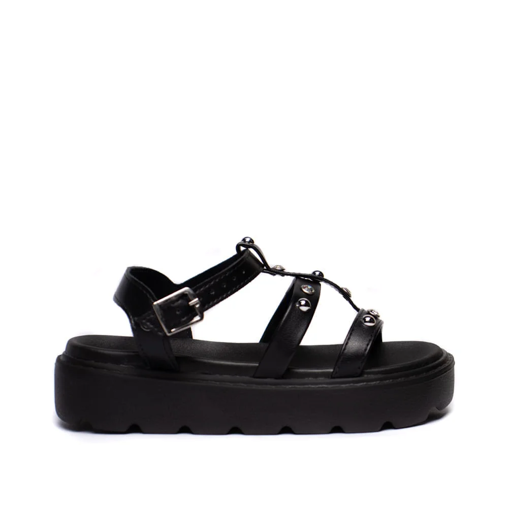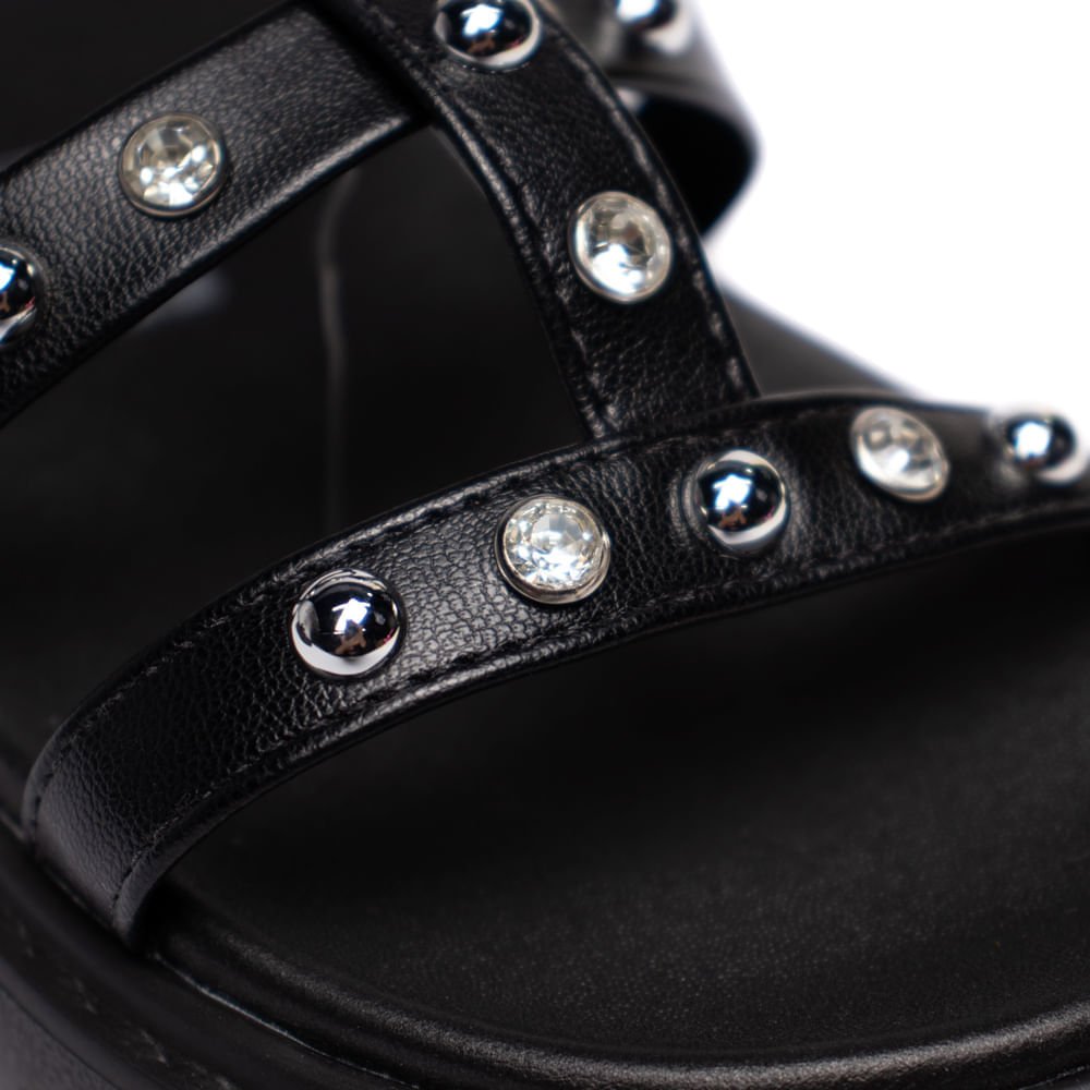 Ref: Com um design moderno e confortável, esta sandália tem sola flatform de 3 cm que oferece leveza e tendência, além de ser leve e fácil de calçar. As tiras maleáveis ¿¿proporcionam um ajuste confortável, e o toque de delicadeza é garantido pelo detalhe de pedrarias e tachinhas aplicadas na parte frontal, adicionando um toque de brilho e sofisticação ao visual. O material sintético utilizado garante durabilidade e facilidade de limpeza, tornando-a uma opção prática para a rotina.