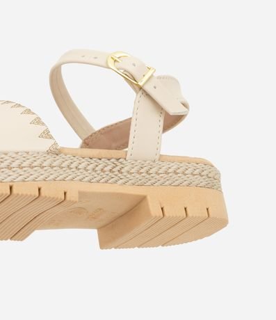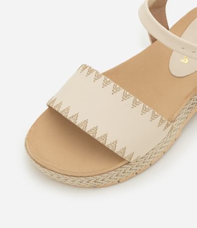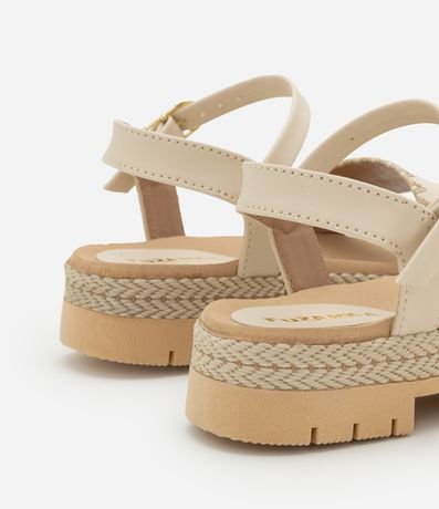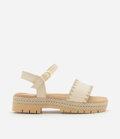Ref: Sandália infantil com bico redondo, com tiras e detalhe de crochê. Possui fechamento no calcanhar por fivela e solado platform com detalhe trançado.