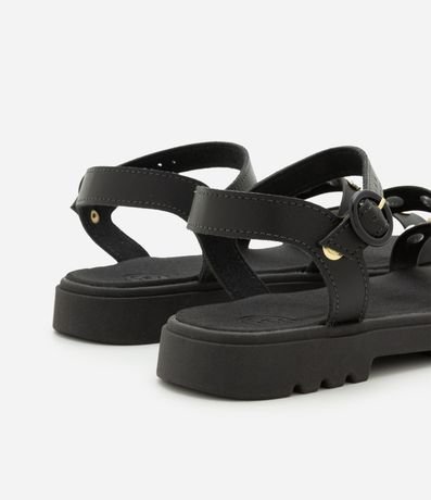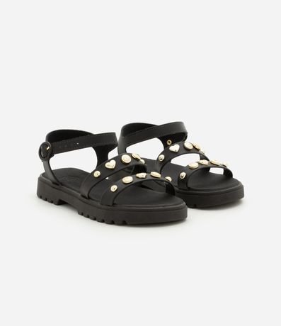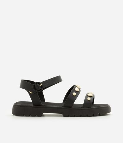 Sandália infantil em PU com fechamento no tornozelo, tiras com tachinhas aplicadas, bico redondo e solado tratoradinho.