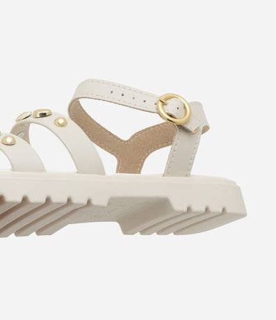 Sandália infantil em PU com fechamento no tornozelo, tiras com tachinhas aplicadas, bico redondo e solado tratoradinho.