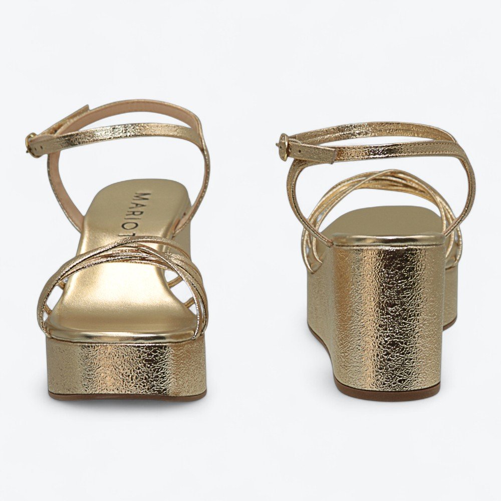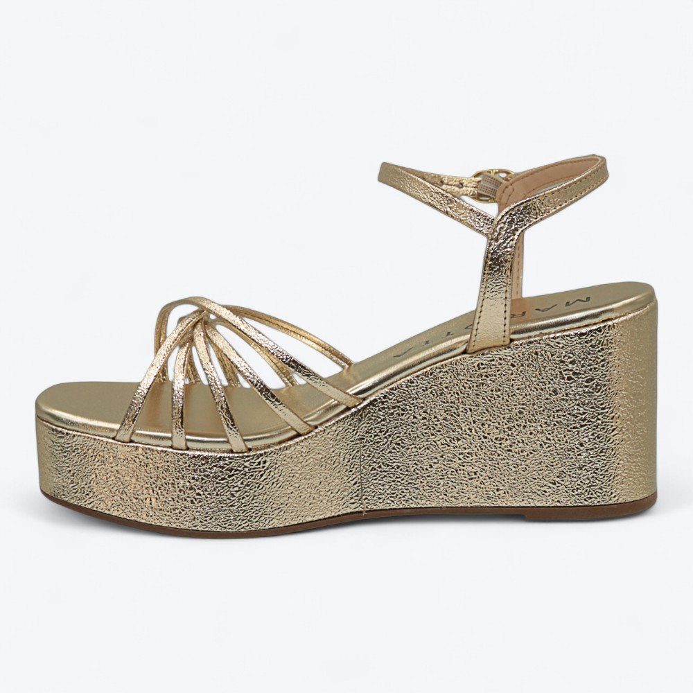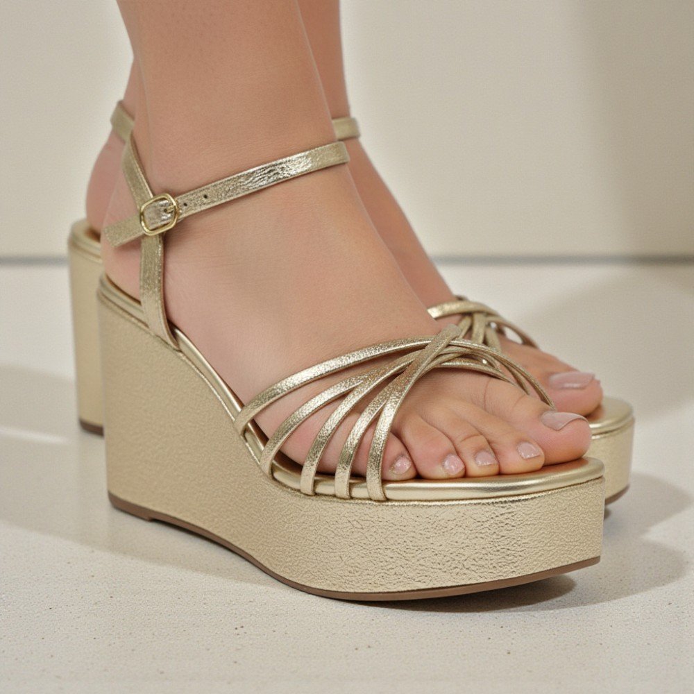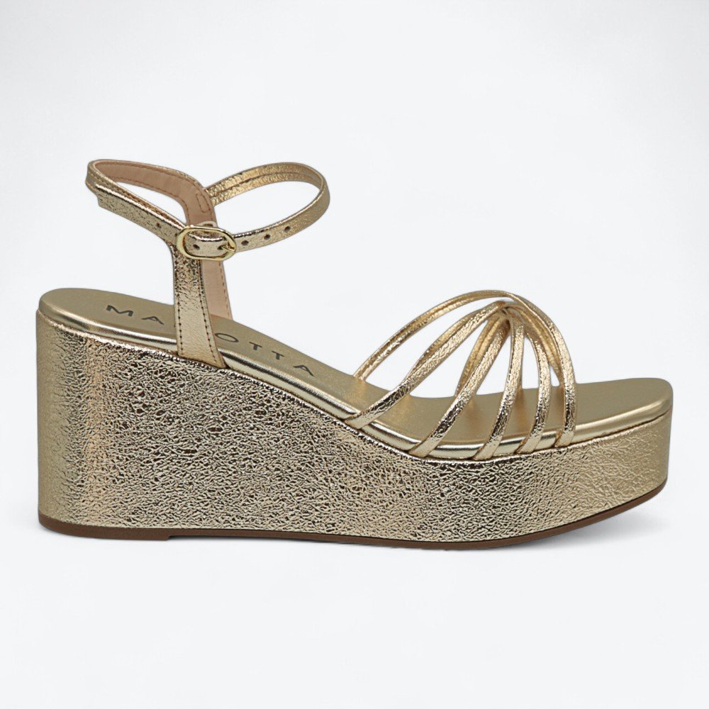 Para brilhar com conforto! Esta anabela Mariotta une tiras finas metalizadas que valorizam o peito do pé com salto plataforma inteiro, garantindo altura com muita estabilidade. A tira no tornozelo com fivela ajustável proporciona encaixe seguro, enquanto a palmilha macia acompanha você do evento ao passeio. O acabamento dourado eleva qualquer produção, do básico chic às festas.