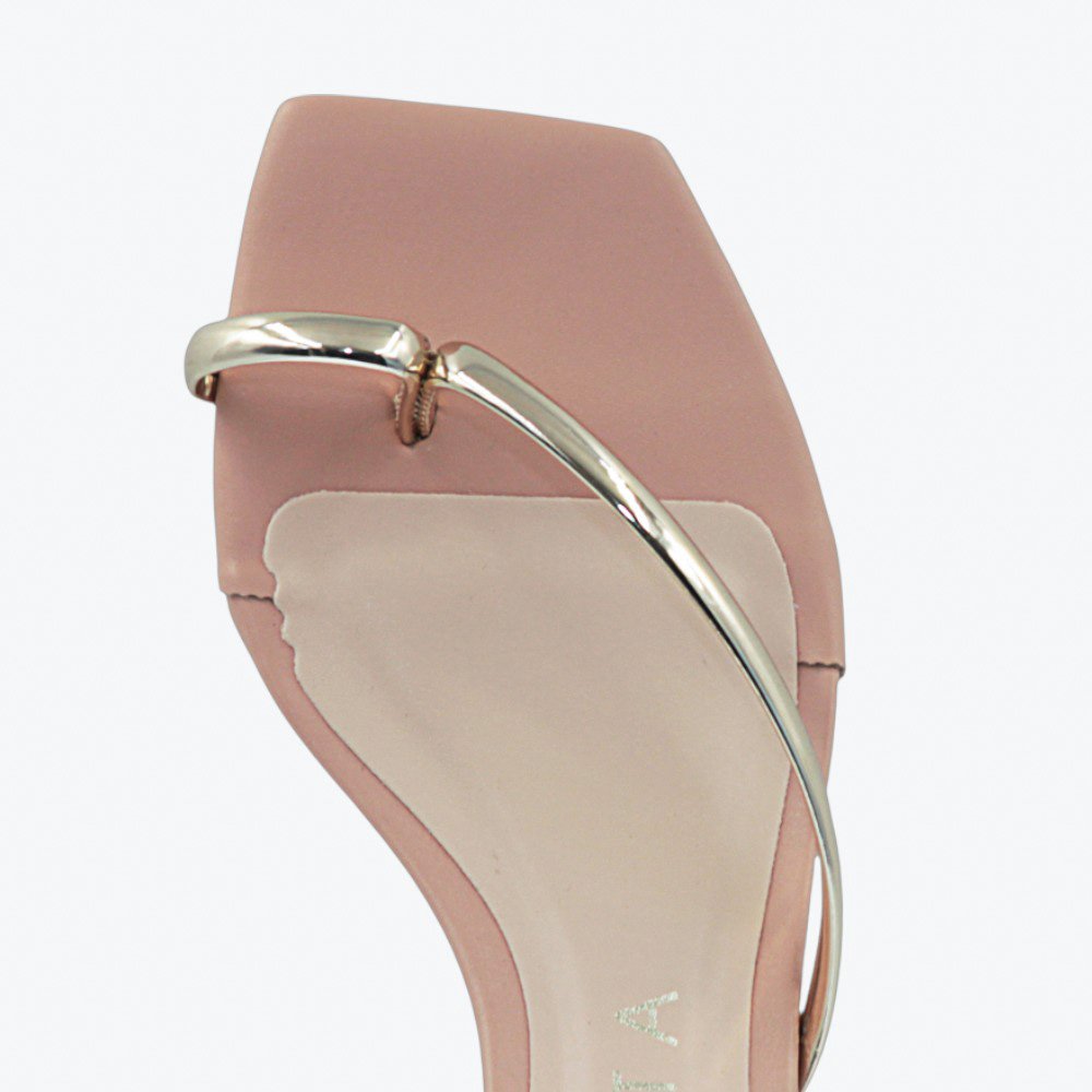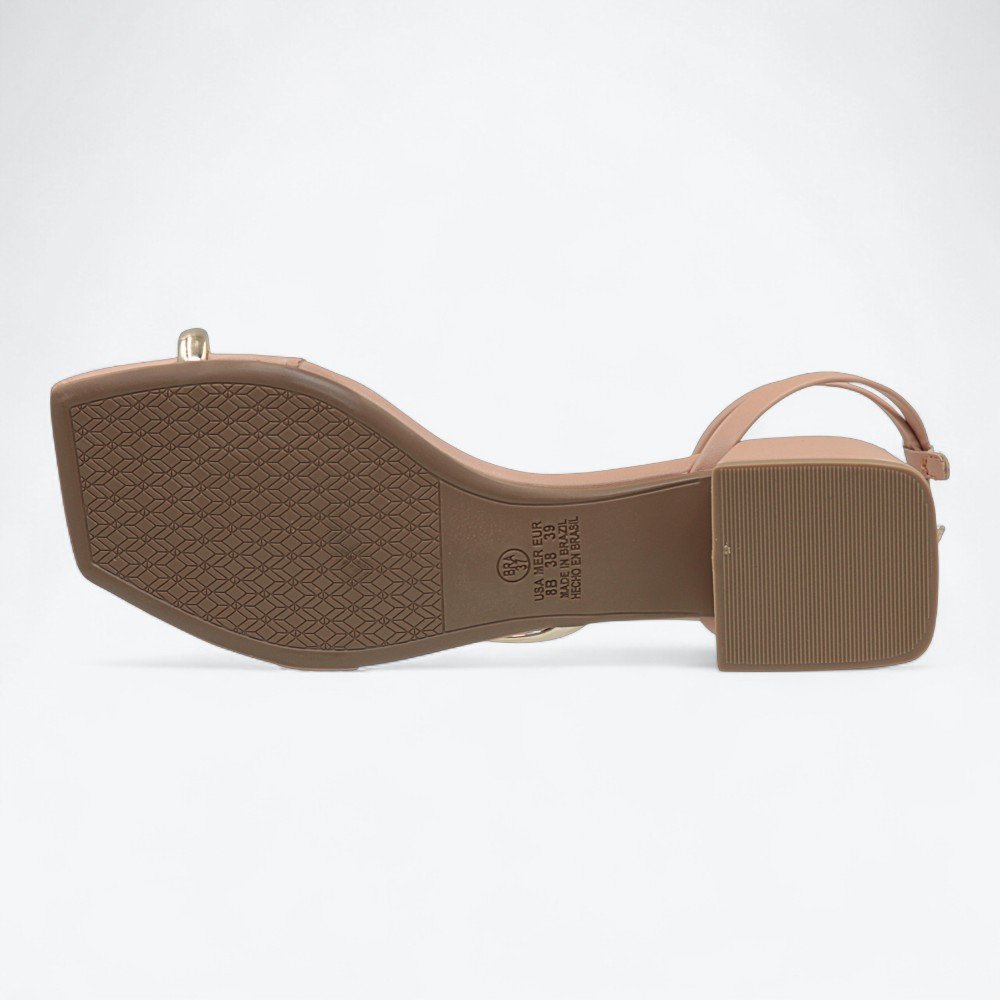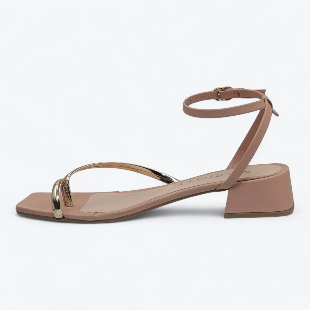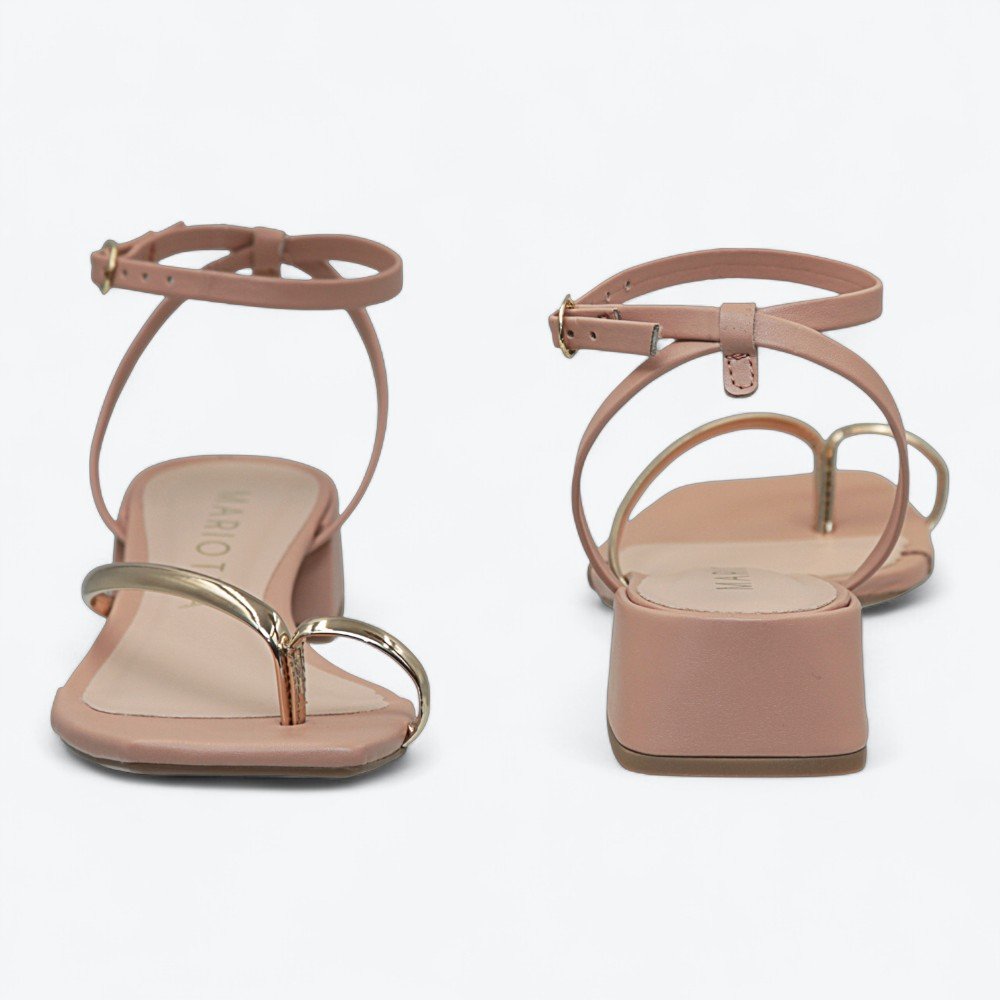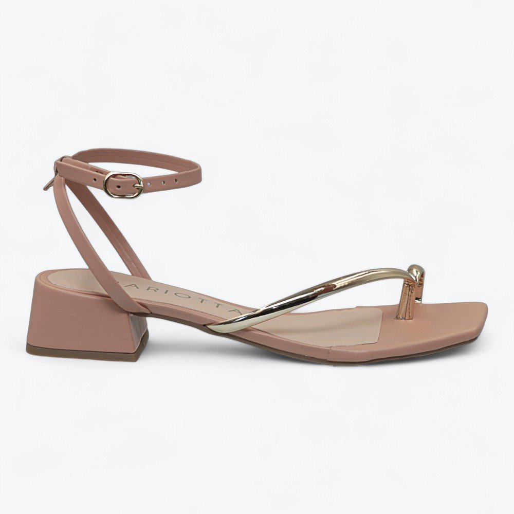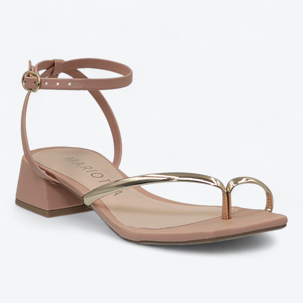 Minimalista e cheia de estilo, esta sandália Mariotta combina cabedal de tiras finas com acabamento metalizado no peito do pé. O destaque é o anel que abraça o dedão com delicadeza, enquanto a tira no tornozelo com fivela garante ajuste perfeito. O salto bloco baixo com base levemente geométrica oferece estabilidade para usar o dia todo, e o bico quadrado traz o toque fashion do momento.