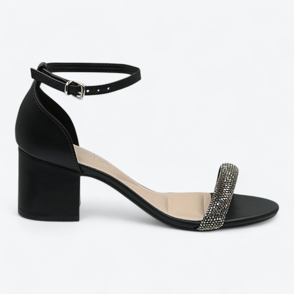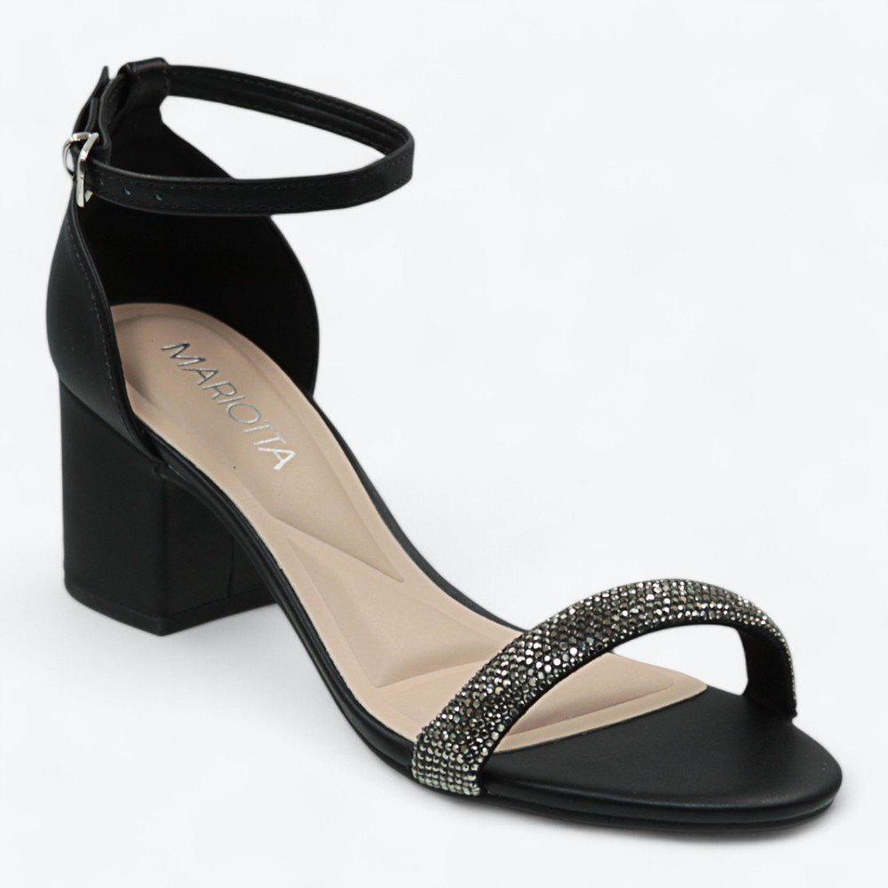 Ref: Descubra a elegância e o conforto com a sandália da marca Mariotta. Este modelo de salto grosso de altura média oferece estabilidade e estilo, ideal para quem busca um calçado versátil para diversas ocasiões. Confeccionada com material sintético de alta qualidade, a sandália preta é adornada com pedrarias brilhantes na tira larga frontal, conferindo um toque de glamour e sofisticação.