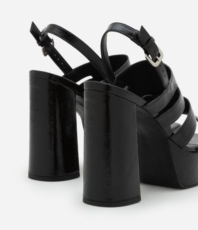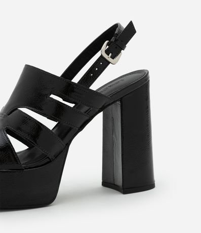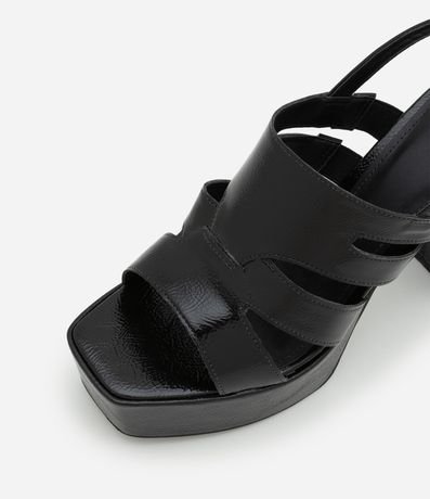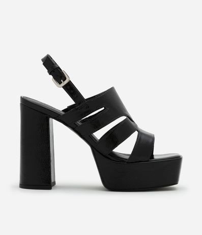 Sandália feminina modelo meia pata, com bico quadrado, fechamento por fivela no tornozelo, salto alto e detalhe de cabedal vazado.