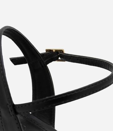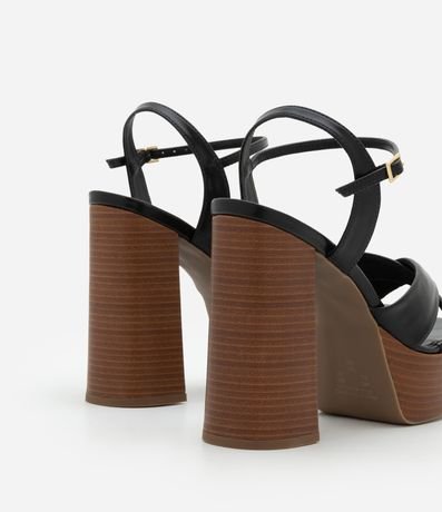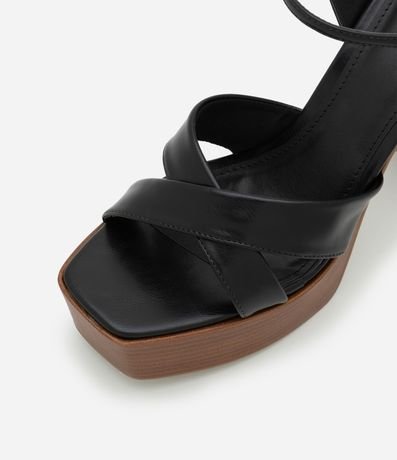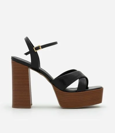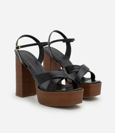Ref: Sandália feminina confeccionada em material sintético no modelo meia pata, com tiras cruzadas, bico redondo, salto super alto, fechamento por fivela lateral, e contraste.