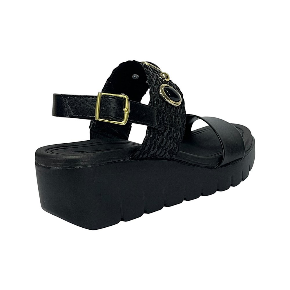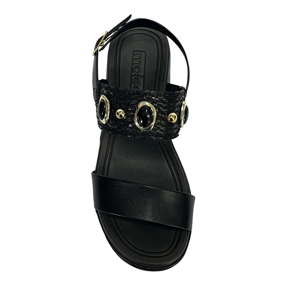 Ref: A Sandália Moleca Anabela é a escolha perfeita para unir conforto e sofisticação em um só modelo. Confeccionada em Napa Turim com detalhe em ráfia trançada, ela ganha ainda mais personalidade com as aplicações metálicas e pedras decorativas na tira central, que realçam o visual moderno e elegante. Na cor preta, transmite versatilidade e pode ser combinada facilmente com diferentes produções, do casual ao mais refinado. O salto anabela de 4,5 centímetros, aliado à meia pata de 2,0 centímetros, garante estabilidade e conforto, enquanto o solado em EVA ultraleve proporciona leveza a cada passo. O fechamento por fivela ajustável no tornozelo oferece segurança e praticidade para o dia a dia.