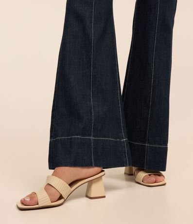 Sandália modelo mule sem fechamento, com bico quadrado, tiras H no cabedal e salto médio grosso.
