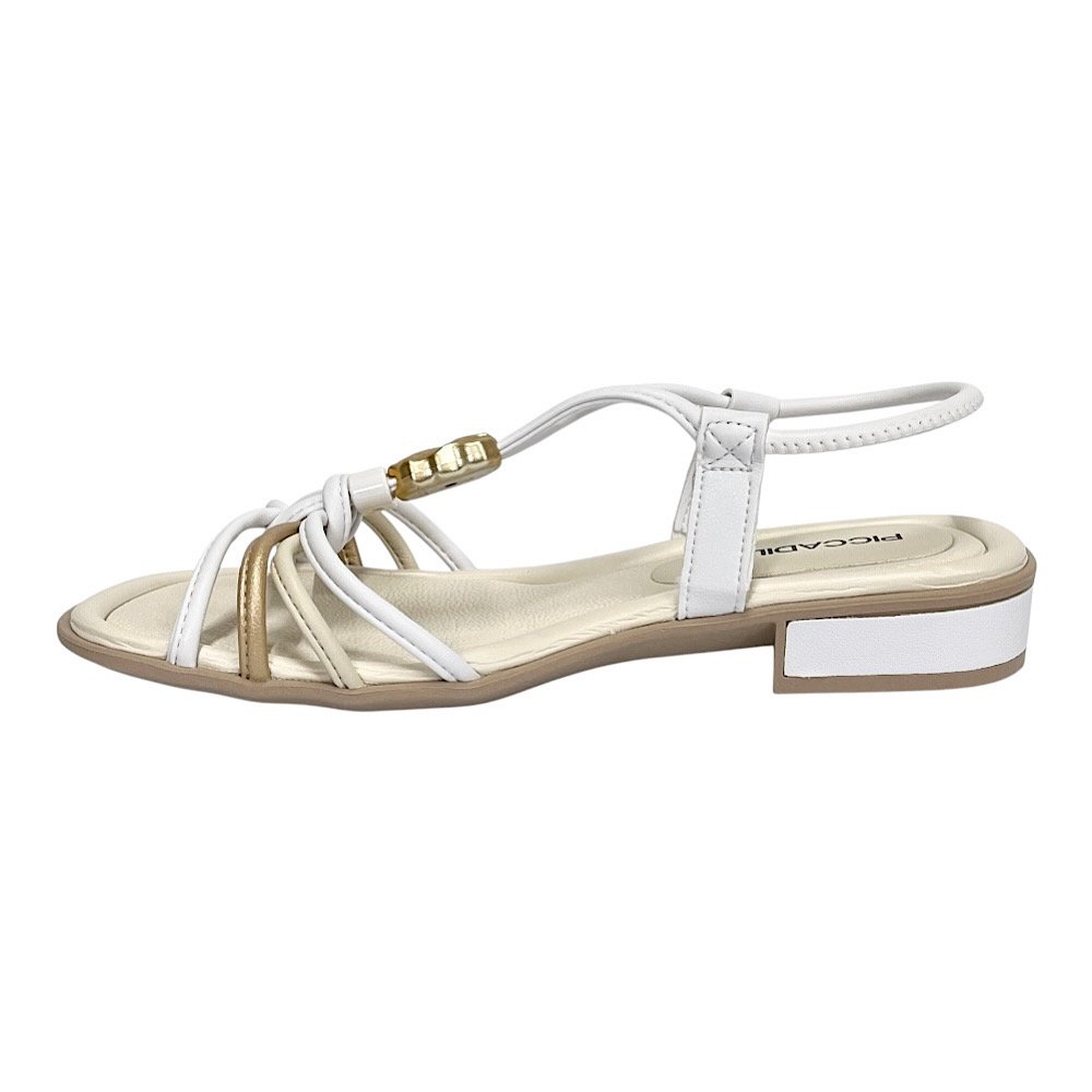 Leve e sofisticada, a Sandália Piccadilly Taila Salto Baixo Branco com detalhes em Dourado combina praticidade e estilo em um só modelo. Confeccionada em Napa Stretch Soft, envolve os pés com suavidade e flexibilidade, enquanto o detalhe metalizado no cabedal adiciona um toque moderno e elegante. O fechamento por tira elástica garante calce fácil, tornando o uso ainda mais prático no dia a dia.