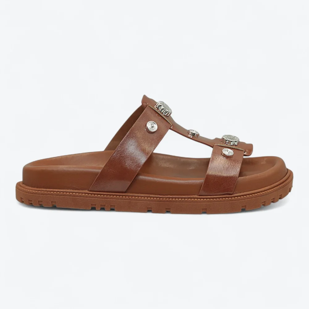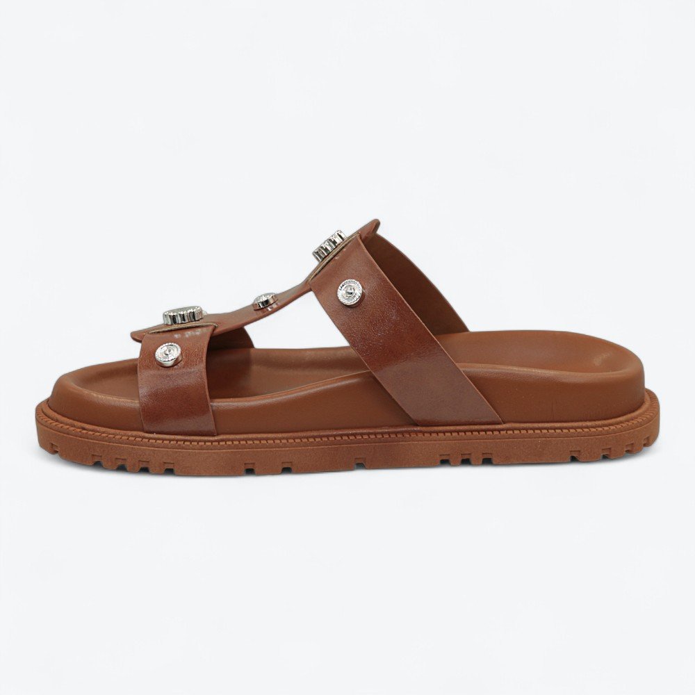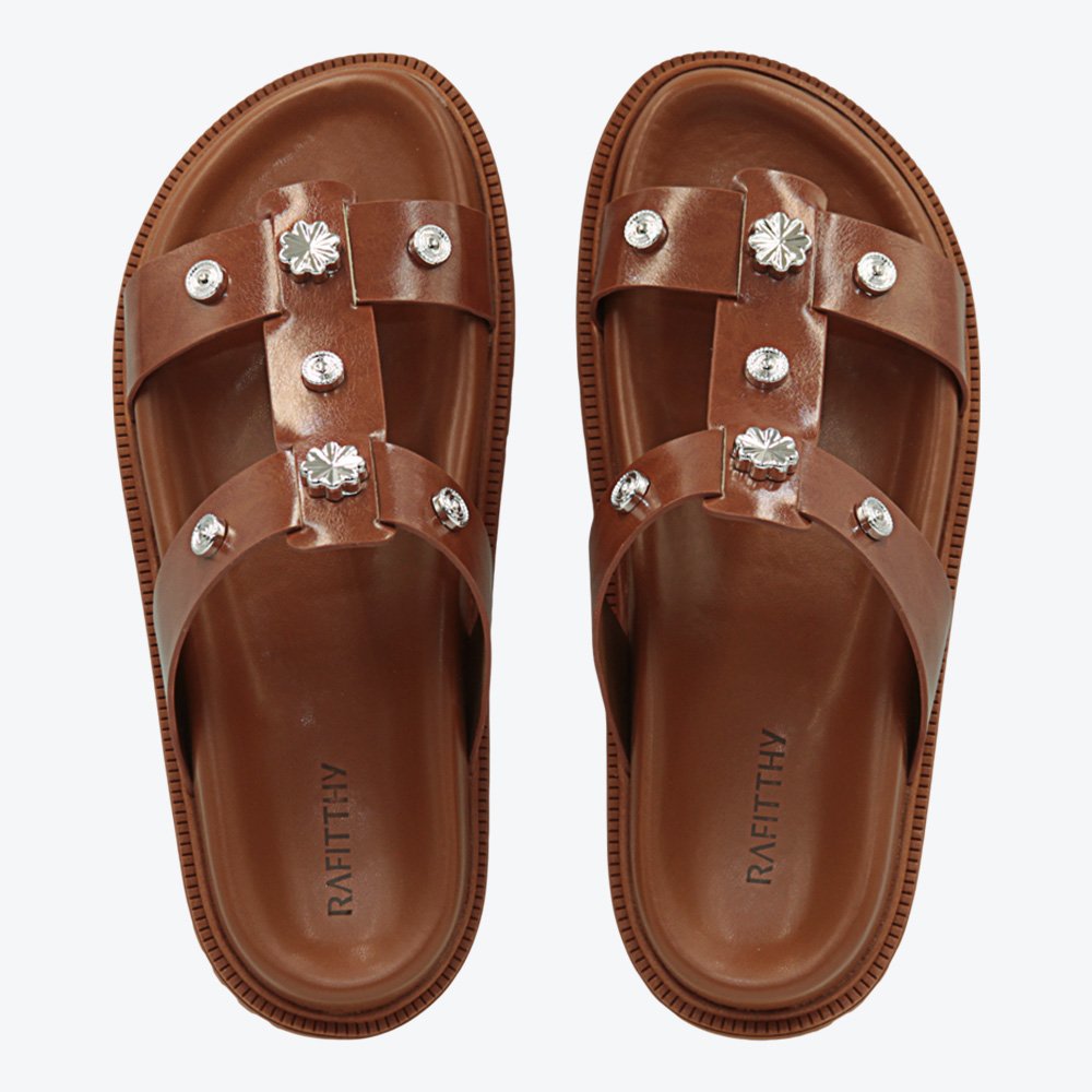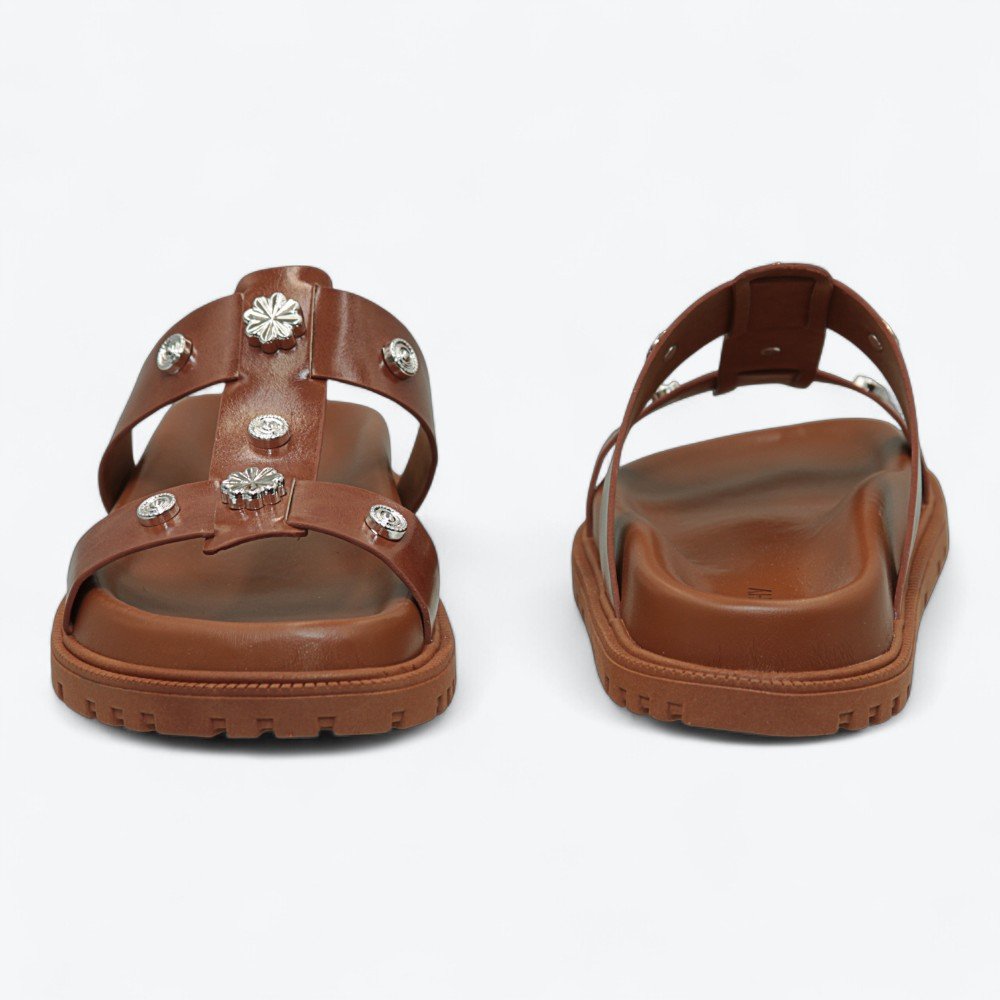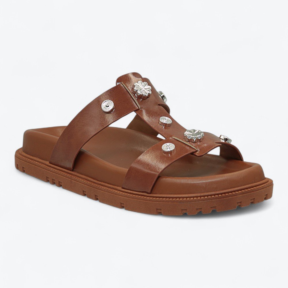 Ideal para quem busca unir conforto e atitude em um só calçado, a sandália papete da Rafitthy é a escolha certa para destacar seus looks do dia a dia. Com tiras largas que garantem estabilidade e ajuste perfeito, ela se destaca pelos apliques metálicos em formato de flor e elementos delicados que adicionam um toque moderno e feminino.