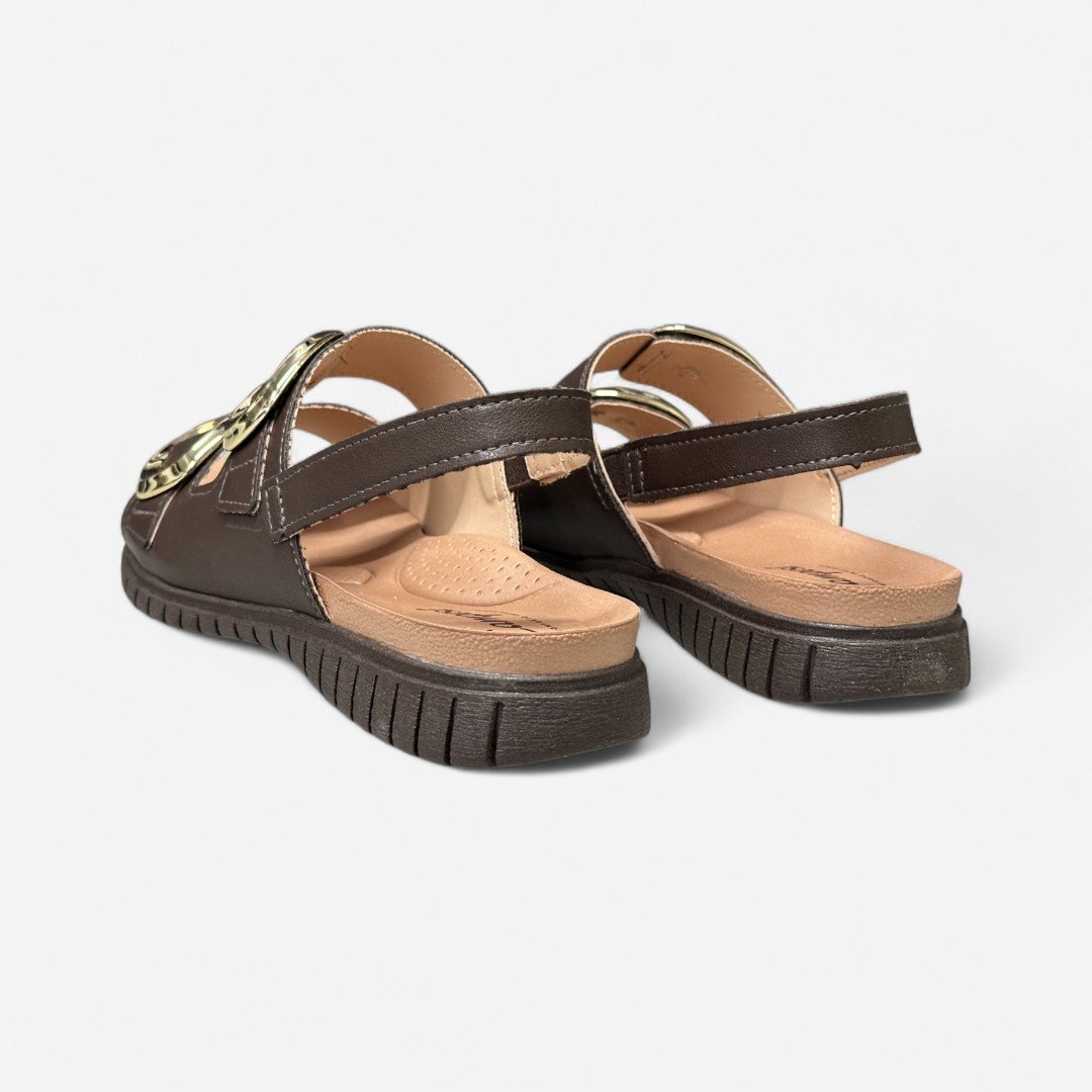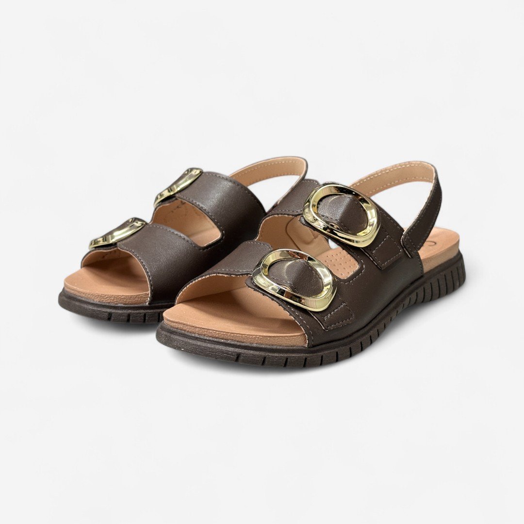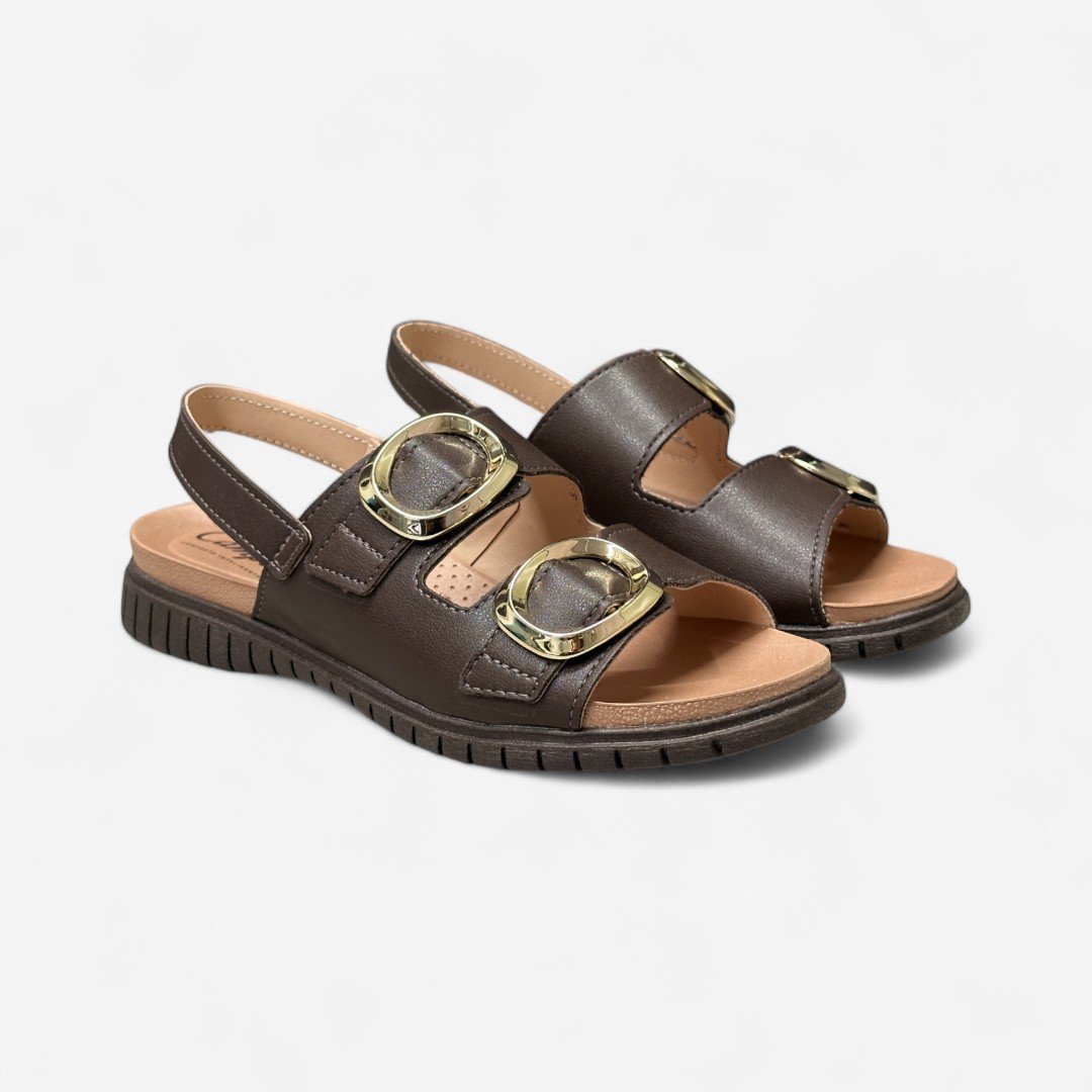 Fechamento: velcro de calce fácil com detalhes em fivelas decorativas