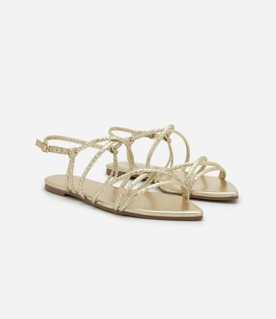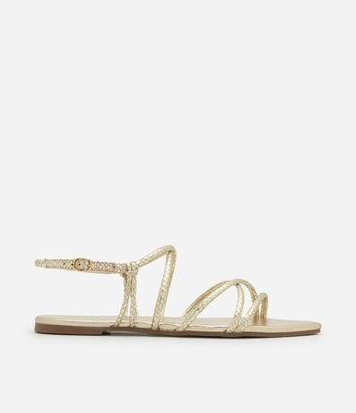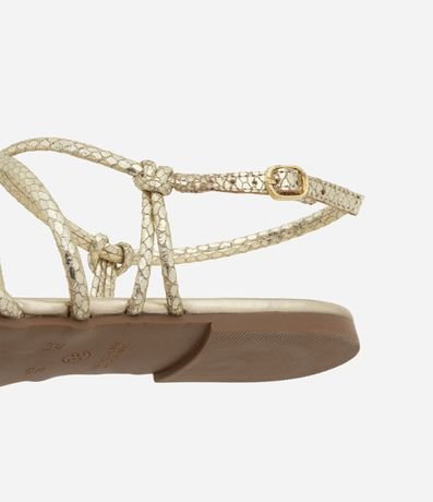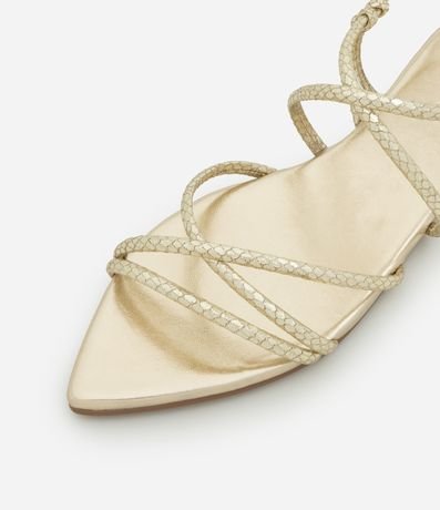 Sandália feminina rasteira com bico folha, tiras cruzadas tubulares com textura cobra.