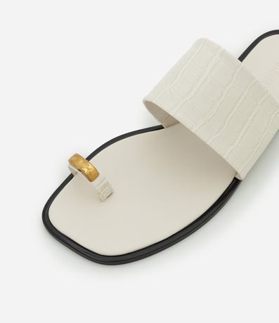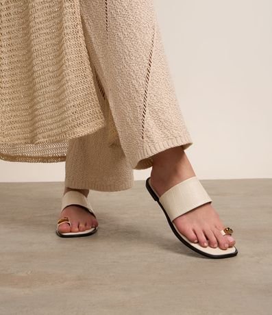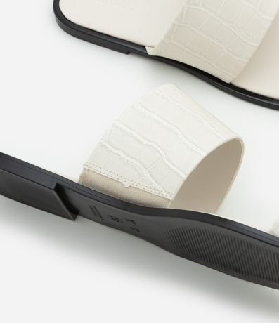 Ref: Sandália rasteira feminina confeccionada em material sintético, bico redondo com dedeira, detalhe contrastante, alça larga, sola contrastante, e textura croco.