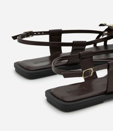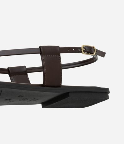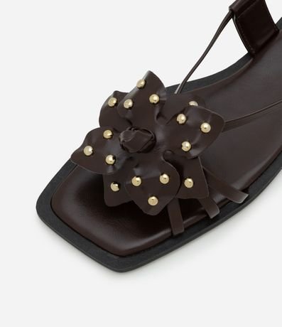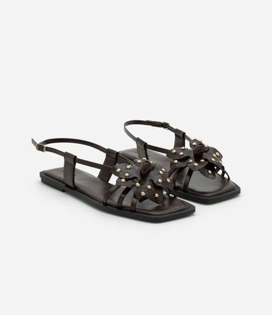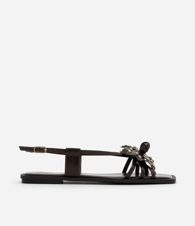Ref: Sandália feminina em material sintético, no modelo rasteira com bico quadrado, tiras finas com flor central e strass, fechamento de tira fina com fivela quadrada.