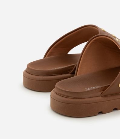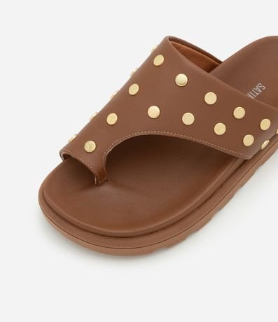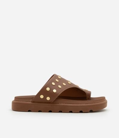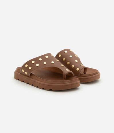Sandália feminina confeccionada em material sintético com dedeira, tira assimétrica larga, aplicação de tachinhas e sola tratorada.