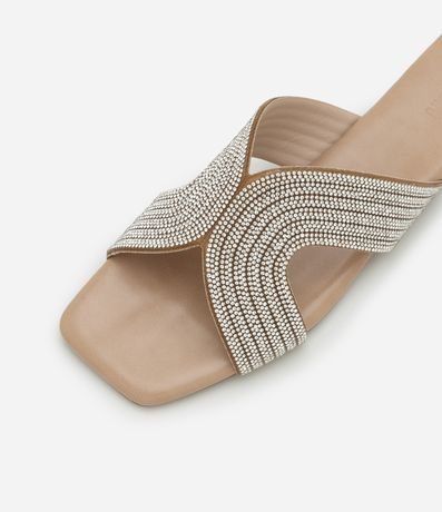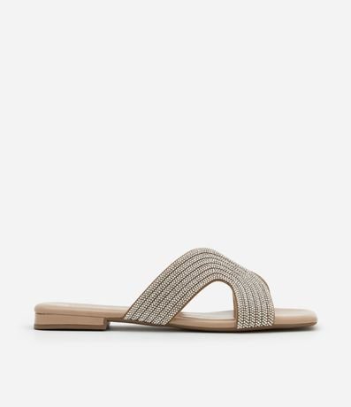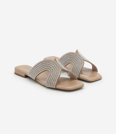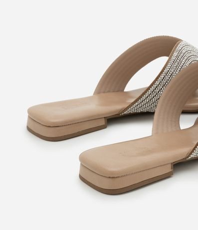 Ref: Sandália feminina no modelo rasteira com bico quadrado com tiras largas brilhosas.