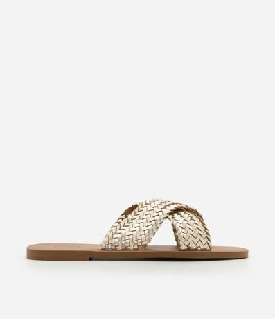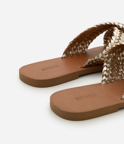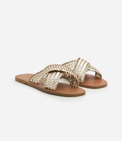 Ref: Sandália feminina confeccionada em material sintético, no modelo rasteirinha com bico quadrado, tiras largas cruzadas com efeito tressê metalizado.