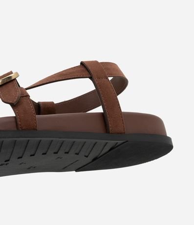 Sandália feminina confeccionada em material sintético com bico redondo e detalhe no dedo, peça rasteira, com tiras cruzadas, efeito camurça e fivela lateral arredondada.