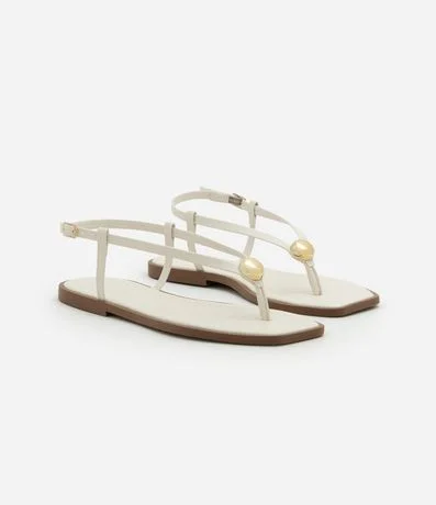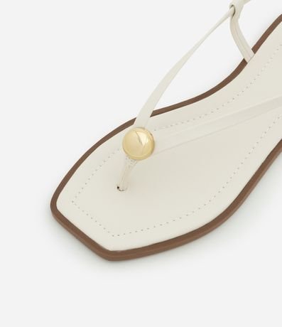 Sandália feminina rasteira confeccionada em material sintético com bico quadrado, tiras finas, fivela lateral e detalhe de metal bold.