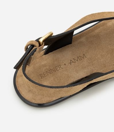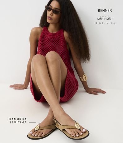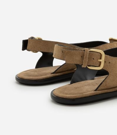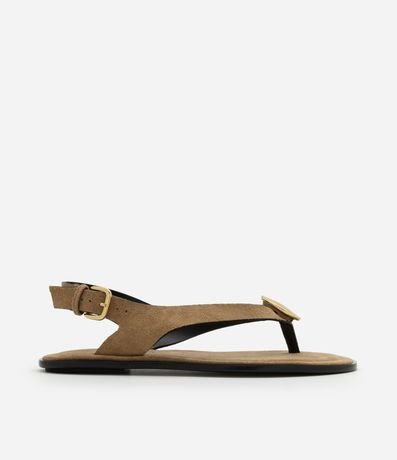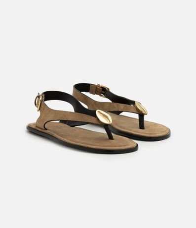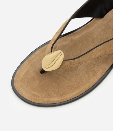 Sandália rasteira de dedo, confeccionada couro camurça legítimo, com aviamento metalizado em formato de búzio.