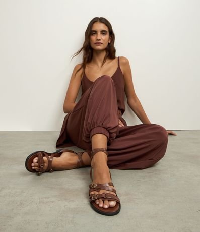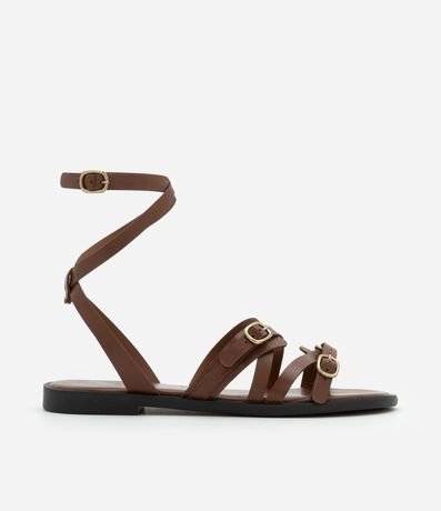 Ref: Sandália rasteira de PU, com bico redondo, fivelas múltiplas sendo uma delas no tornozelo.Salto de 01 centímetro.
