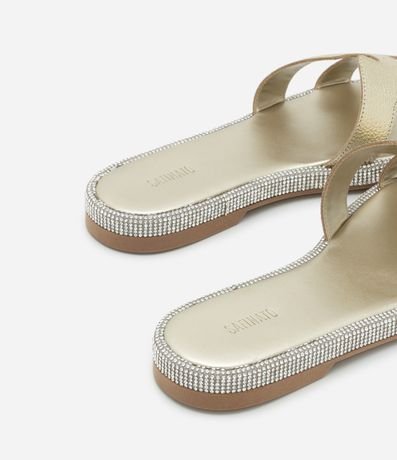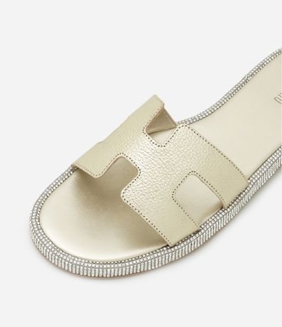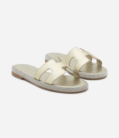 Sandália rasteira com cabedal H em material de couro sintético e strass no salto.