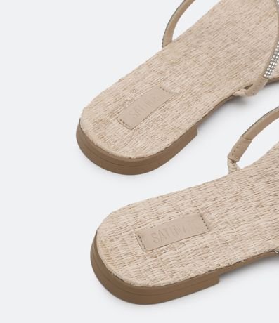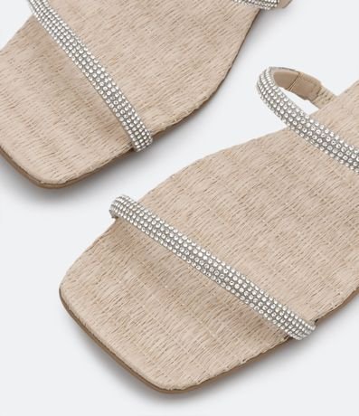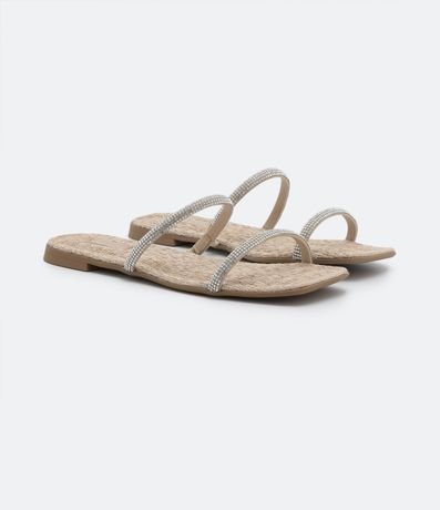 Ref: Rasteirinha feminina, com textura em ráfia, duas tiras com strass e bico quadrado.