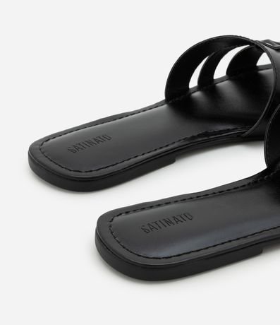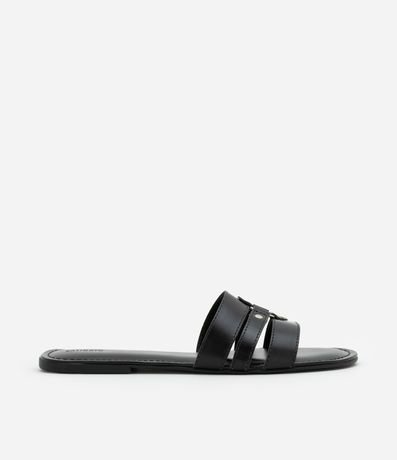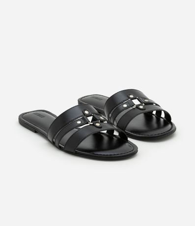 Ref: Sandália feminina modelo rasteira flat mule, com efeite de tachinhas no centro e confeccionada em PU.