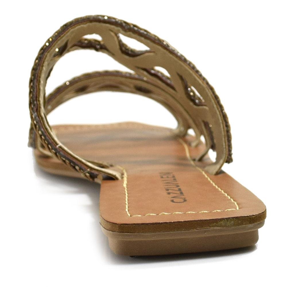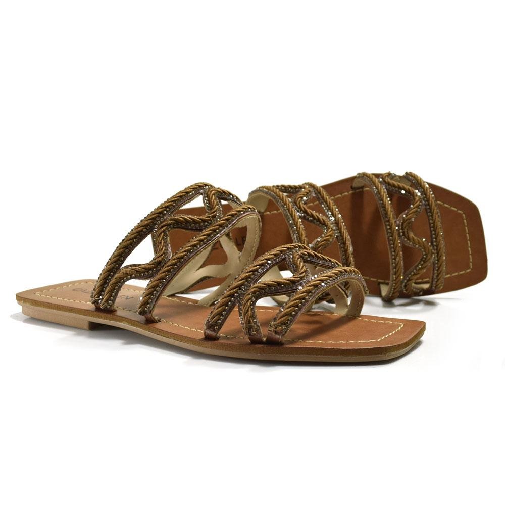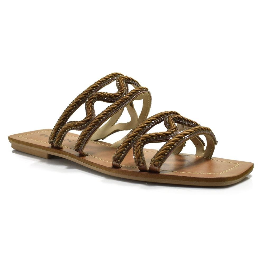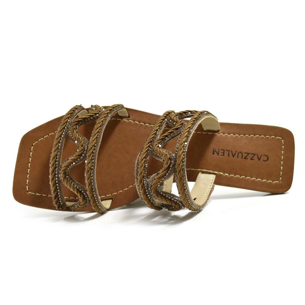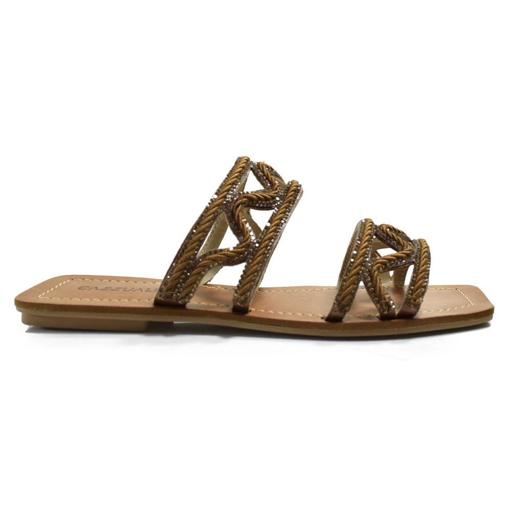 Sandália Rasteira Feminina CazzualenA Sandália Rasteira Feminina Cazzualen em tom marrom é a escolha perfeita para quem busca elegância com um toque artesanal e moderno. Seu design conta com tiras entrelaçadas que criam um visual delicado e sofisticado, valorizando o pé com total leveza. O acabamento metalizado discreto nas tiras adiciona um brilho sutil, ideal para compor looks casuais ou mais arrumados, especialmente no verão.