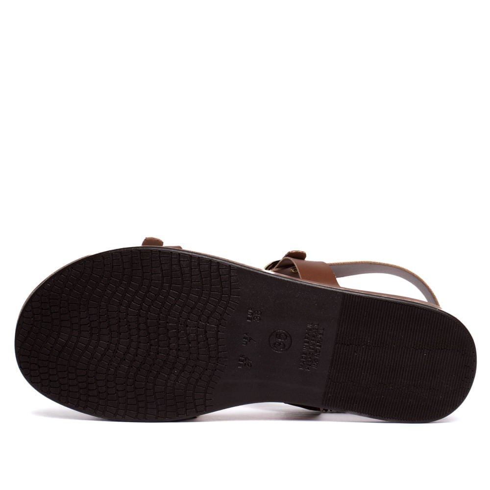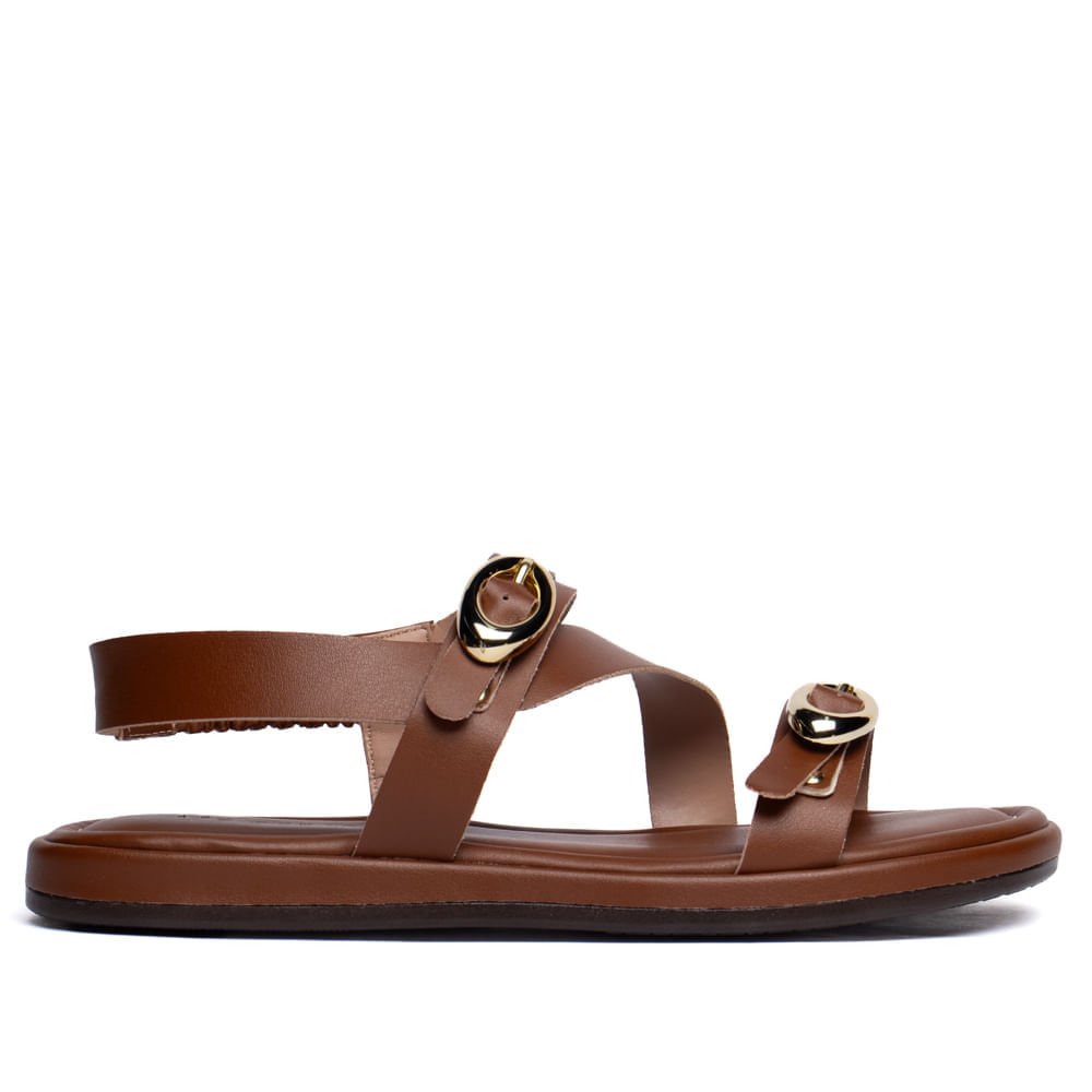 O detalhe das fivelas douradas adiciona um toque elegante e feminino, destacando a sandália em produções casuais ou mais arrumadas. O tom marrom versátil permite combinações fáceis com vestidos, saias e calças leves.