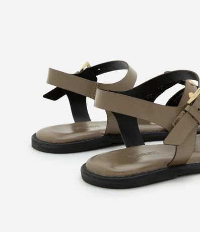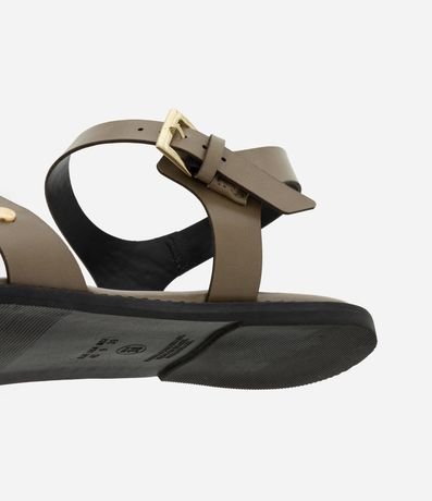 Sandália rasteira fisherman, confeccionada em PU, com fivela com tira e tachas metalizadas aplicadas.
