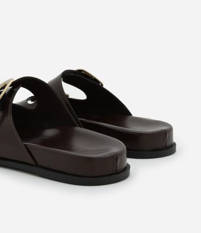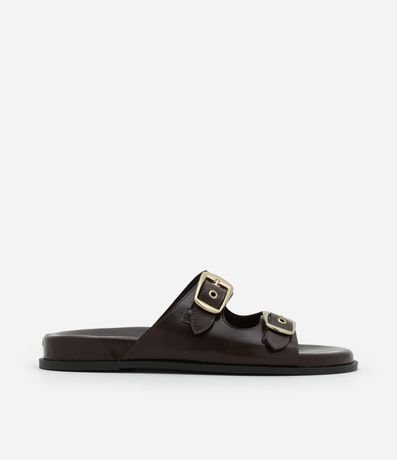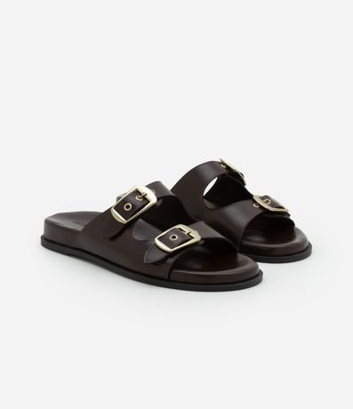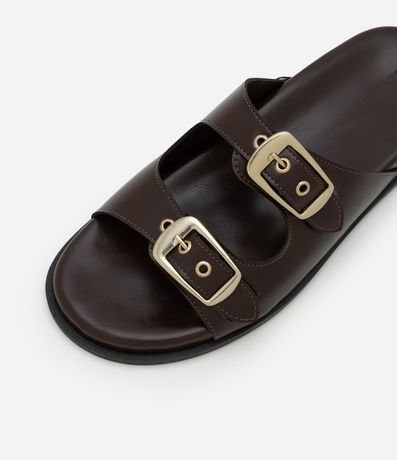 Ref: Sandália rasteira flat com bico redondo, tiras duplas com fivela laterais.