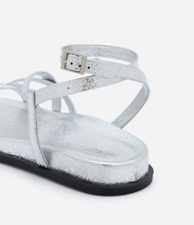 Rasteirinha feminina metalizada com multi tiras transpassadas, fechamento por fivela no tornozelo e efeito craquelado.