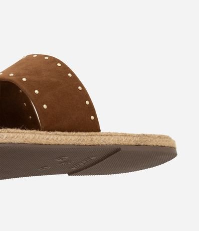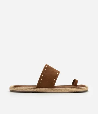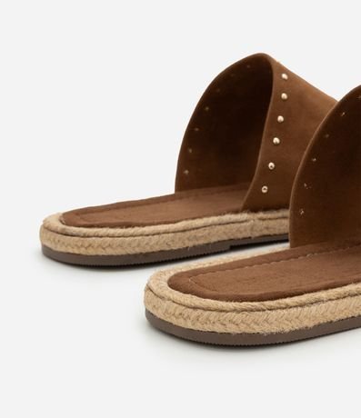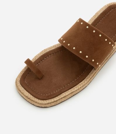 Ref: Sandália feminina no modelo rasteira mule com bico quadrado, dedeira, tira larga com aplicação de rebites e efeito camurça.