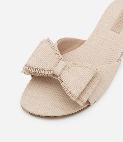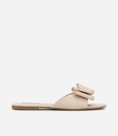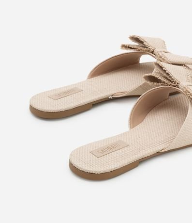 Sandália rasteira, sem salto, confeccionada em material sintético, com tiras diversas e detalhe de laço.