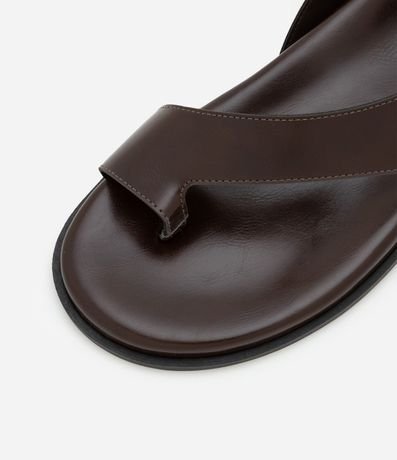 Sandália feminina confeccionada em material sintético, bico redondo, dedal, tira assimétrica, detalhe de fivela lateral contrastante.