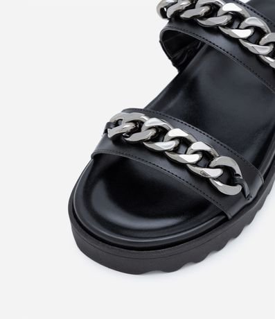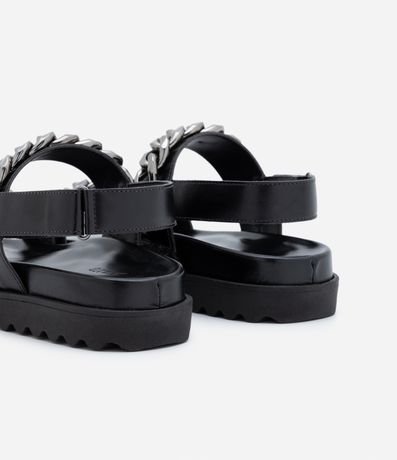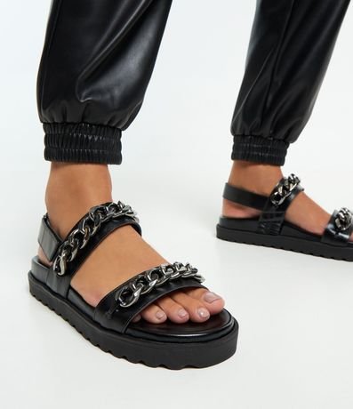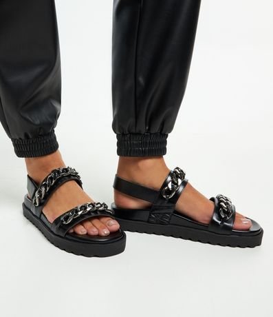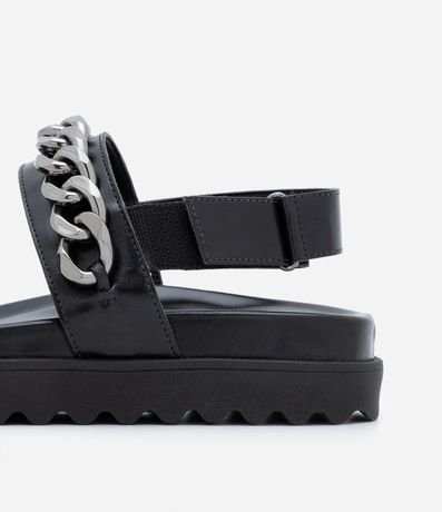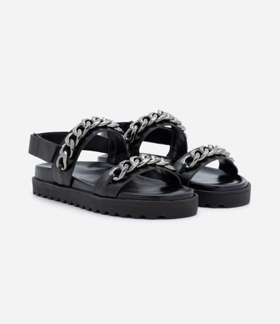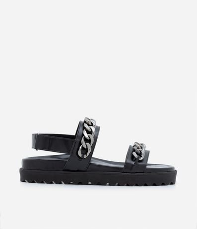Ref: Rasteirinha feminina modelo mais largo, tiras largas com correntes aplicadas, fechamento por velcro e sola tratorada.