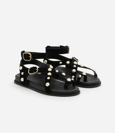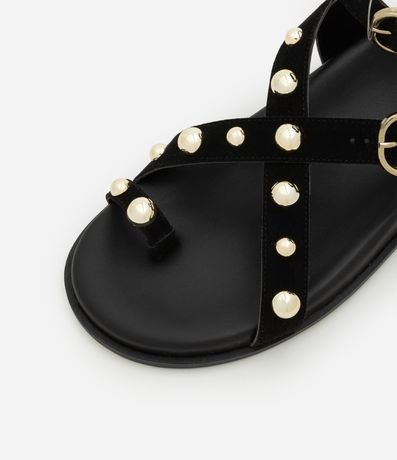 Ref: Sandália feminina no modelo rasteira com bico redondo, dedeira, tiras cruzadas com esferas, e fechamento por fivela lateral redondas.