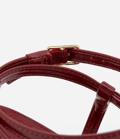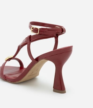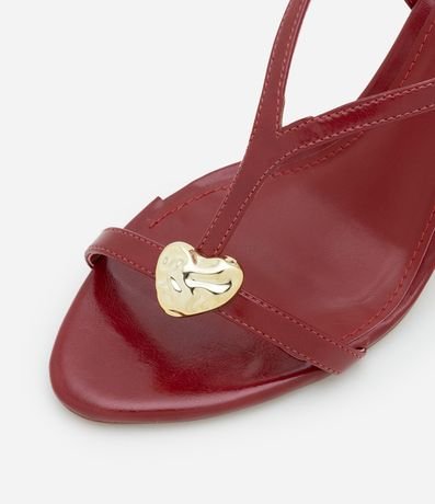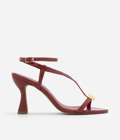 Ref: Sandália de salto alto e formato diferenciado feminina, com tiras e confeccionada em material sintético. Possui enfeite bold metalizado em formato de coração orgânico e fechamento por fivela.