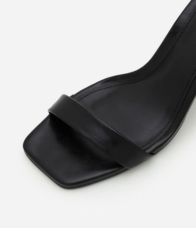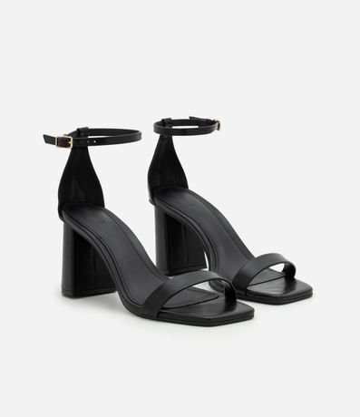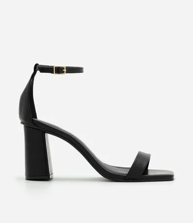 Sandália em PU feminino com tira frontal larga, bico quadrado, calcanhar fechado e tornozeleira fina com fivela metálica ajustável. Possui salto alto bloco, palmilha acolchoada e solado estável, proporcionando firmeza e estrutura ao caminhar.