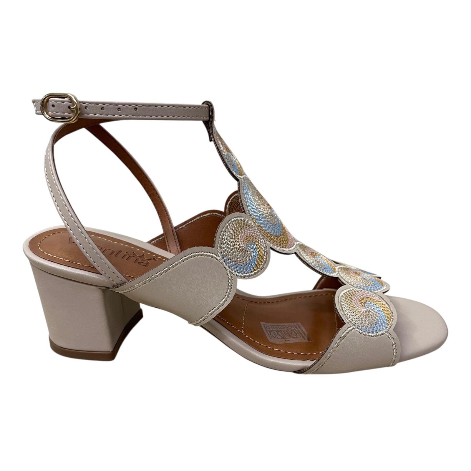 Ref: Sandália de bico arredondado, calcanhar aberto com tira ajustável no tornozelo, cabedal com acabamento bordado que combina delicadeza e modernidade. O acabamento borbado realça o estilo sofisticado.