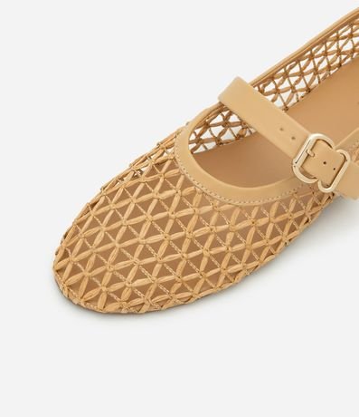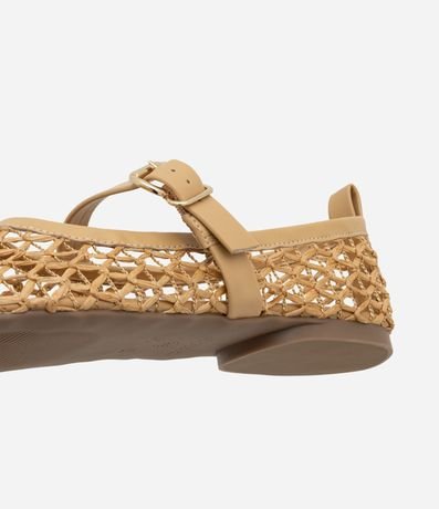 Sapatilha feminina peça com bico redondo, salto rasteiro, tira larga, fivela lateral e efeito ráfia.