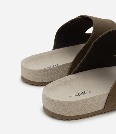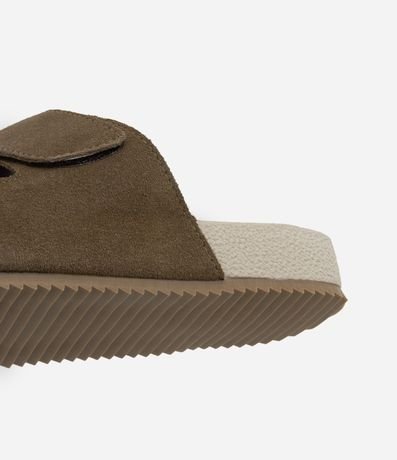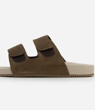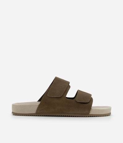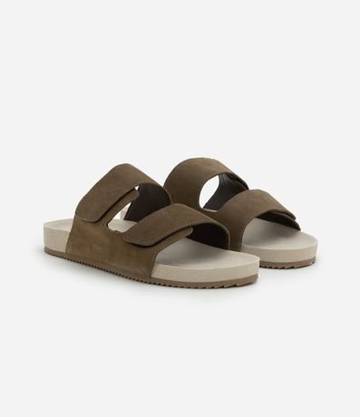 Ref: Sandália masculina confeccionada em camurça com boas práticas ambientais, modelo slide com tiras largas ajustáveis por velcro, garantindo conforto e praticidade para compor looks casuais com estilo moderno e toque sofisticado.