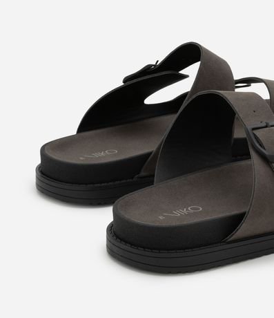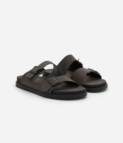 Ref: Sandália slide, confeccionada em material sintético com textura de camurça, com duas tiras com fivelas no peito do pé.