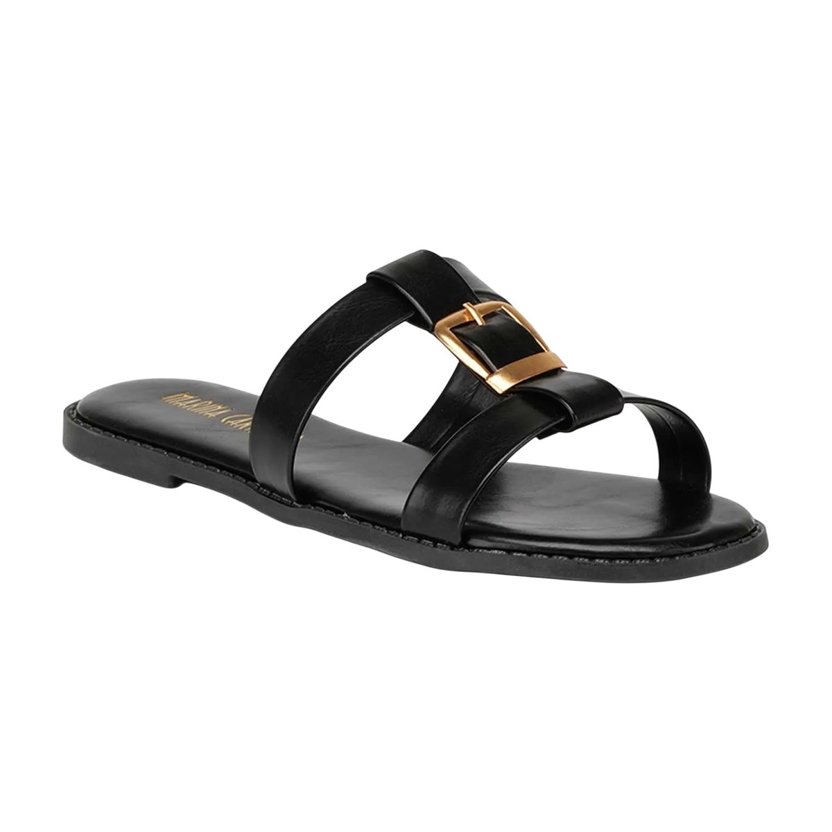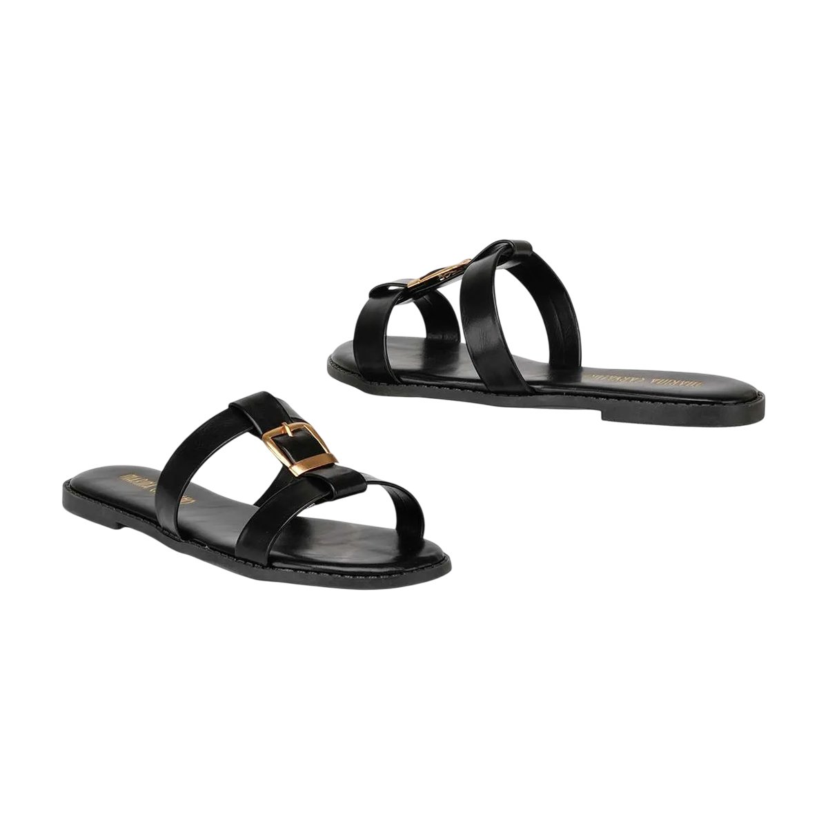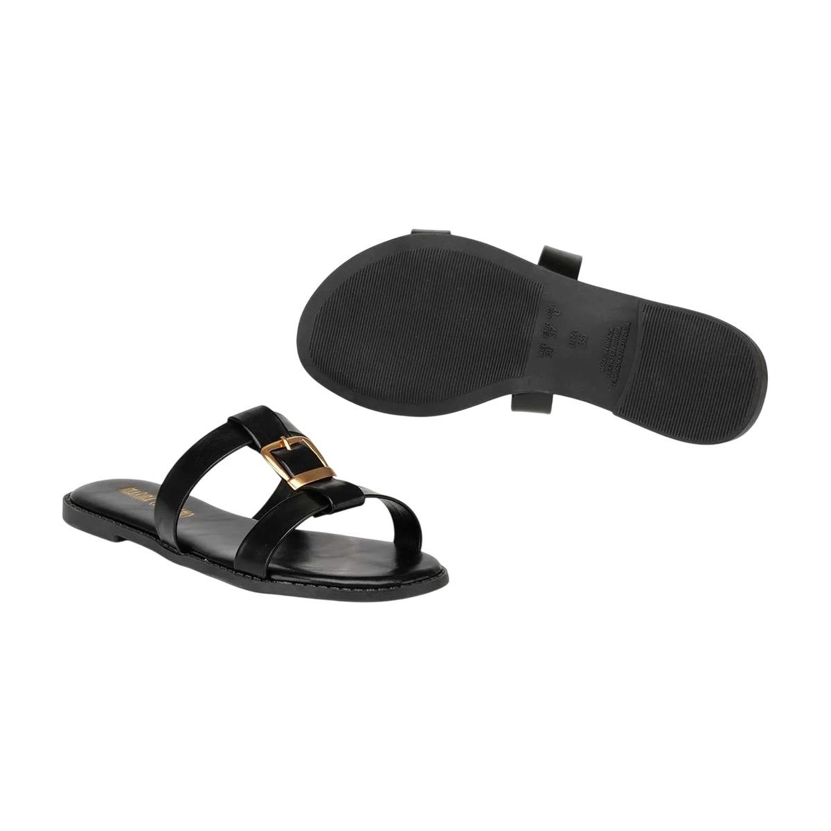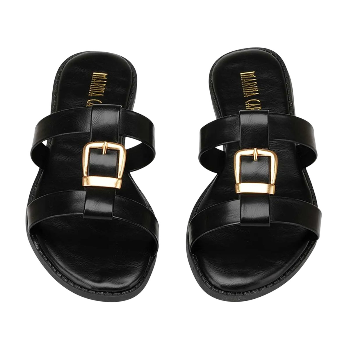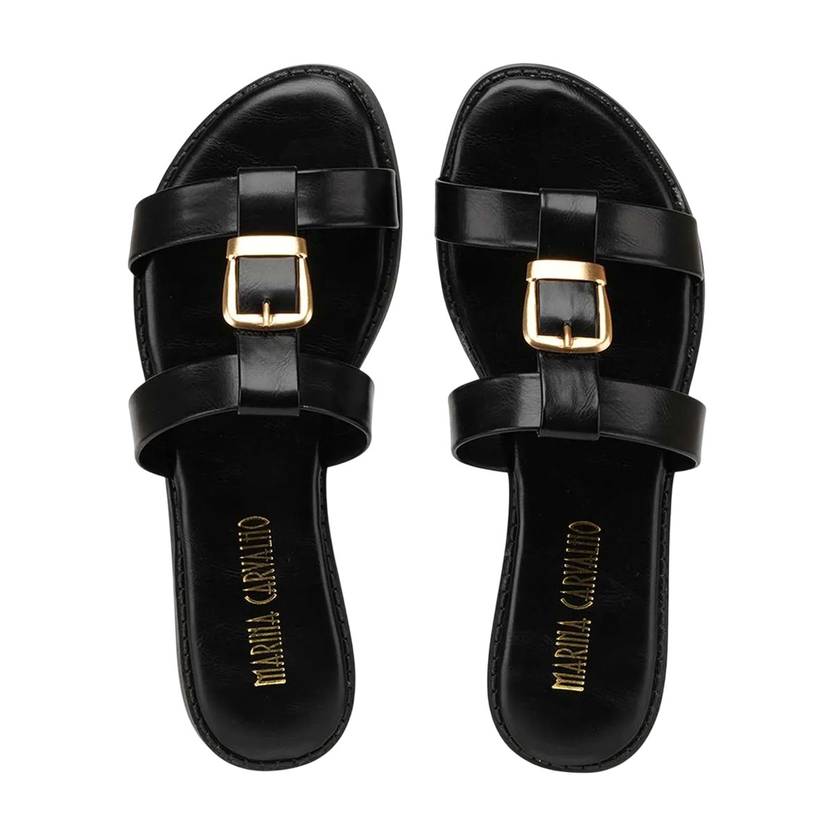 Tipo: Sandália rasteira feminina com tiras duplas e detalhe de fivela