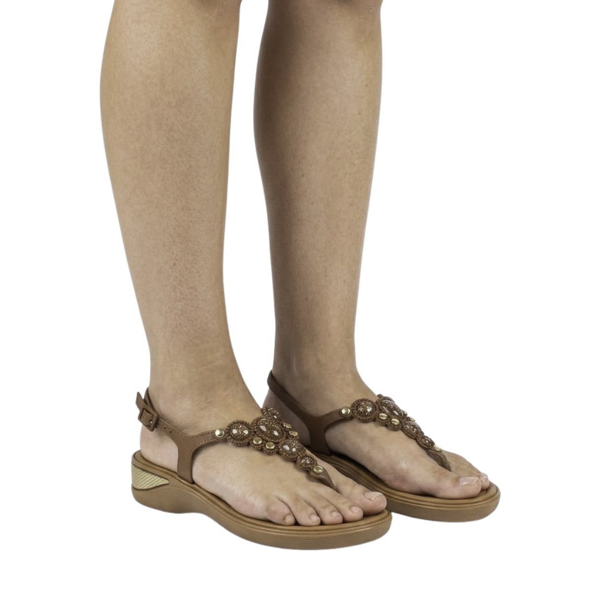 Seu cabedal é produzido em material sintético (PU) de alta qualidade, oferecendo resistência, durabilidade e um acabamento sofisticado. Os detalhes de pedrarias acrílicas aplicados nas tiras adicionam um toque de charme ao visual, deixando a sandália ainda mais elegante.