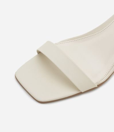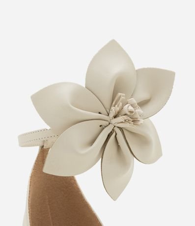 Sandália feminina com tiras finas cruzadas no cabedal, fechamento por fivela, bico redondo e salto bloco médio com com flor aplicada.