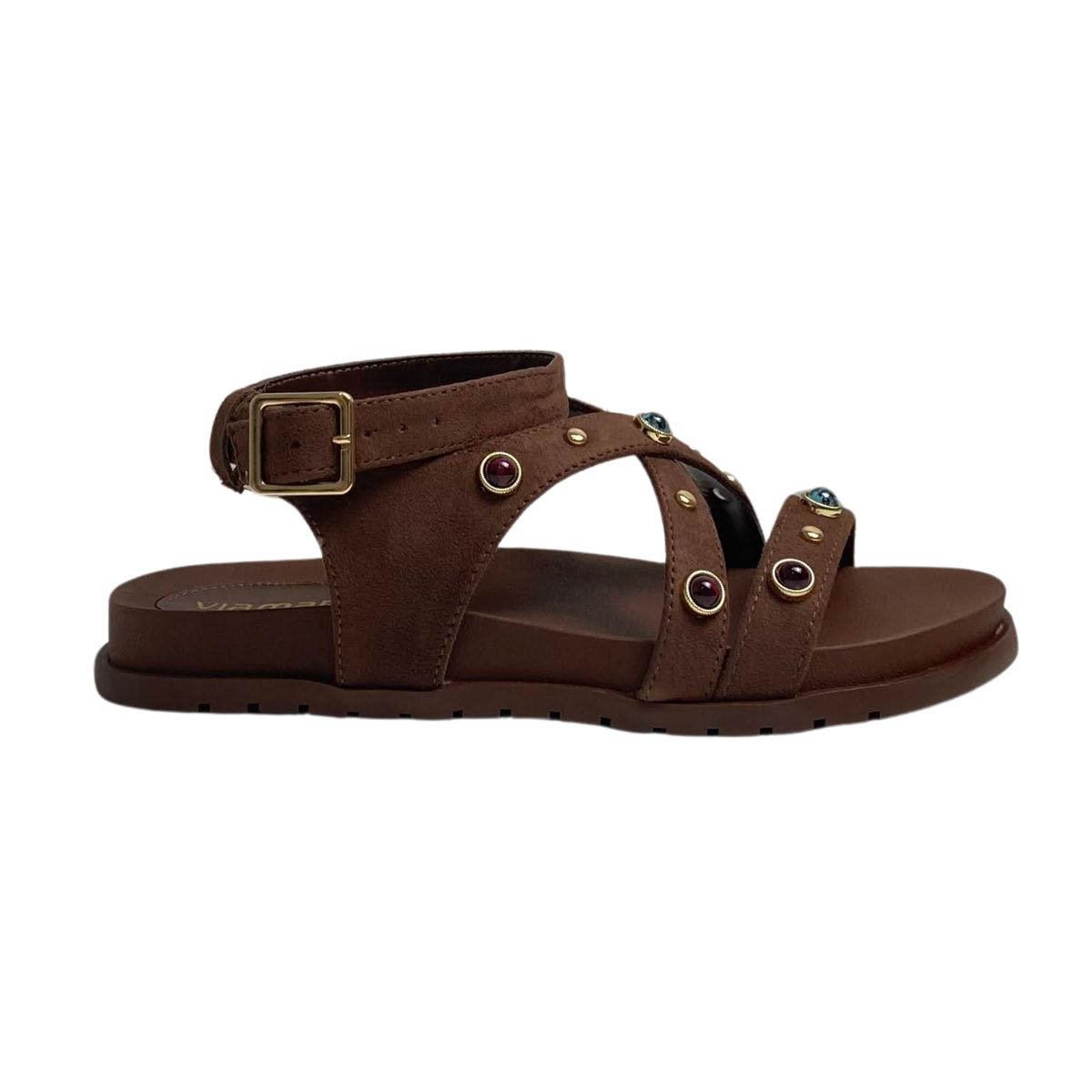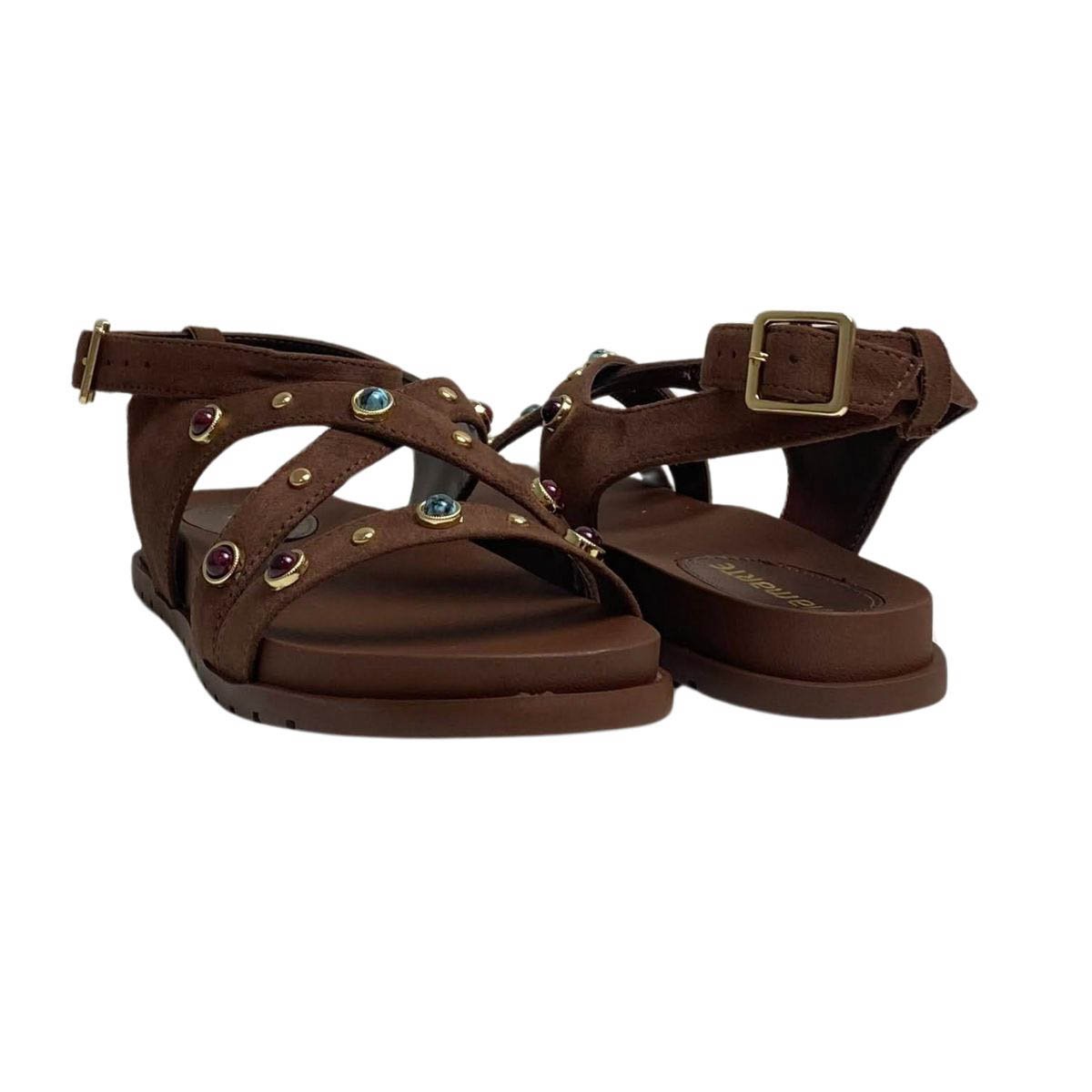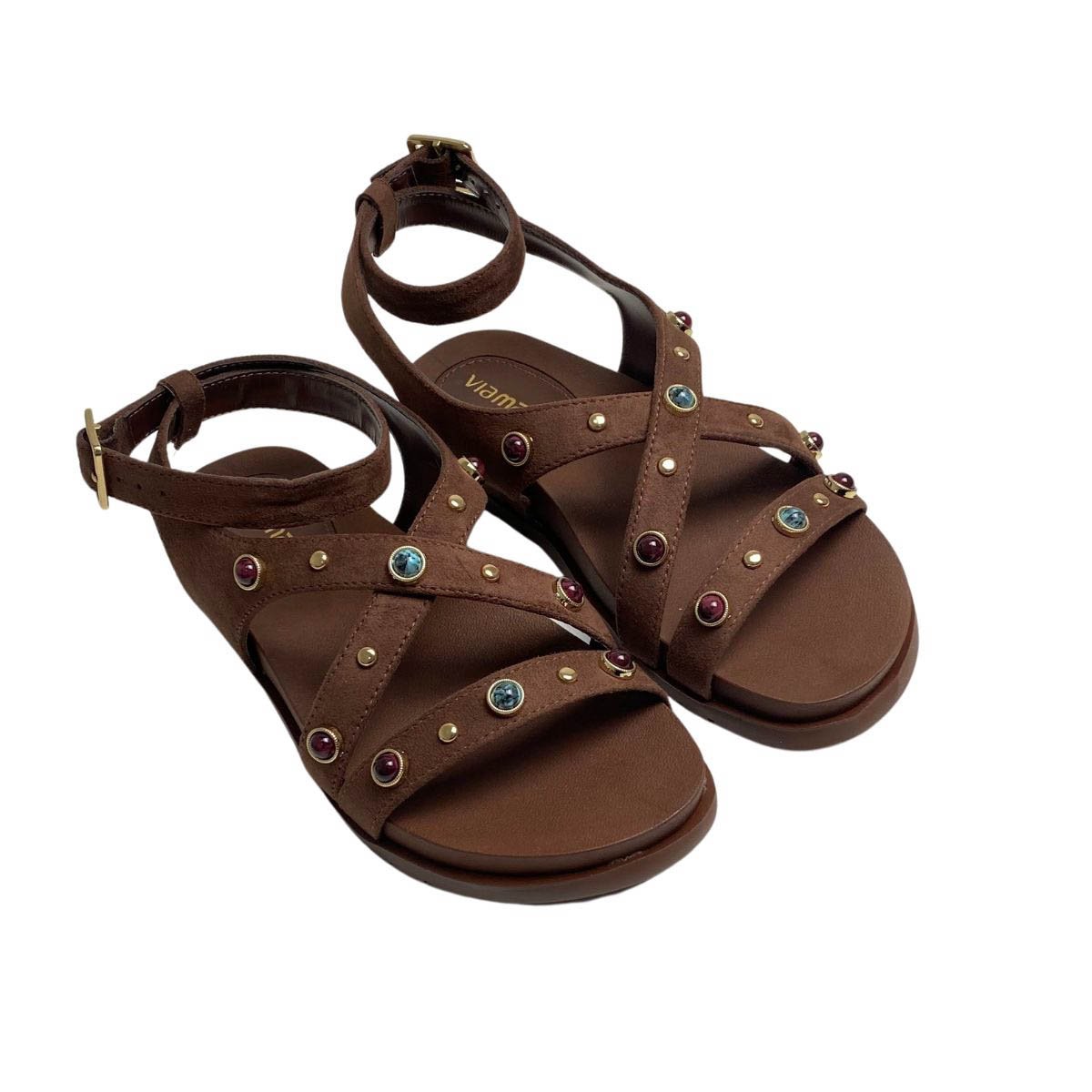 As tiras largas, com toque aveludado, envolvem o pé com charme e elegância. O grande destaque fica por conta das pedrarias coloridas aplicadas, que adicionam um visual boho-chic moderno e cheio de atitude.