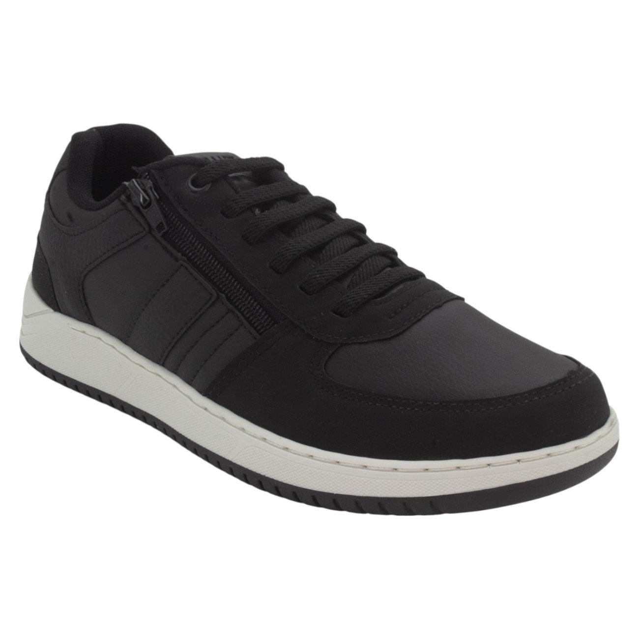 O Sapatênis Masculino Velluti 5974E na cor preta apresenta um design contemporâneo e versátil, unindo um acabamento fosco com detalhes texturizados na biqueira e no calcanhar. Seu cabedal conta com fechamento por elástico e um zíper lateral decorativo que confere um toque urbano ao modelo, enquanto o solado branco com ranhuras onduladas garante aderência e um contraste moderno. Com acabamento pespontado, este calçado é a escolha ideal para compor looks casuais com praticidade e estilo.