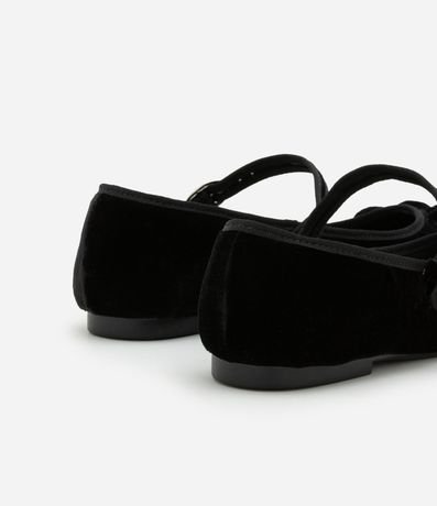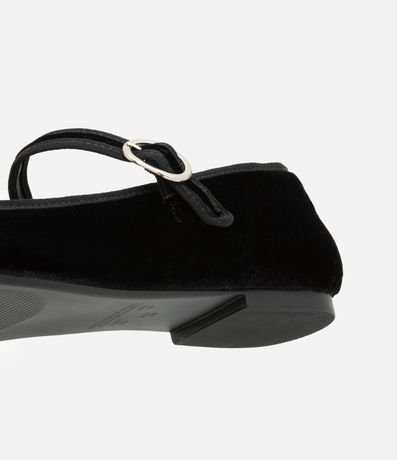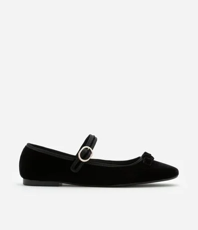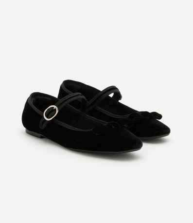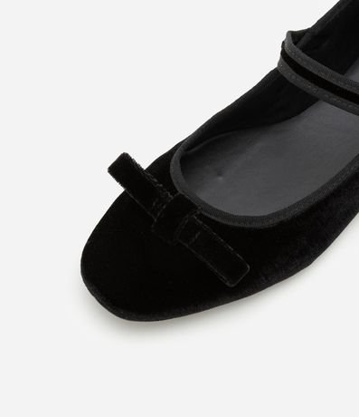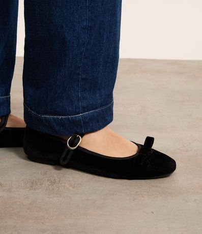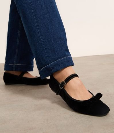 Ref: Sapatilha de bico quadrado com textura aveludada, com tira com fivela de metal no peito do pé, salto baixo e bico quadrado. O charme do calçado se dá pelo lacinho aplicado no peito do pé!
