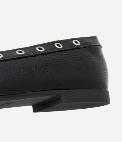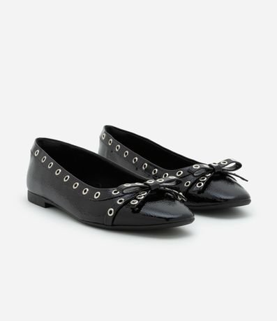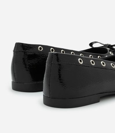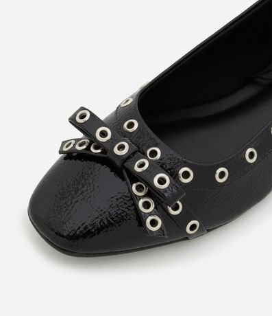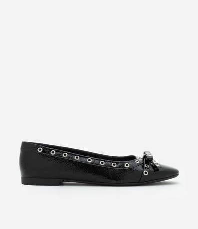 Ref: Sapatilha feminina confeccionada em PU com bico quadrado e aplicações de ilhós e laço.